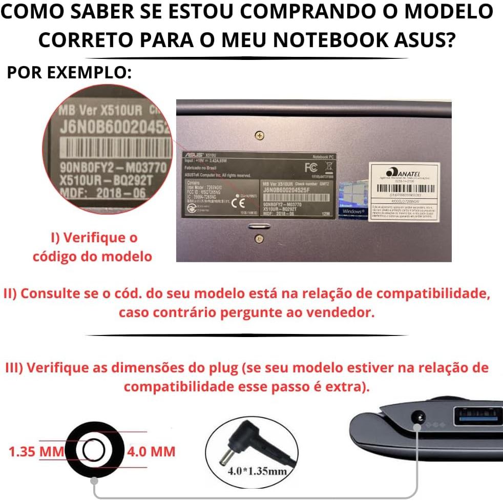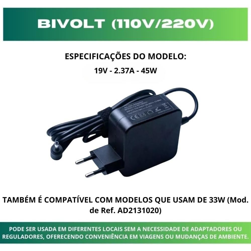 Carregador Fonte Notebook 19V 2.37A 45W ASUS Vivobook Zenbook Pino Fino 4.0x1.35mm bivolt