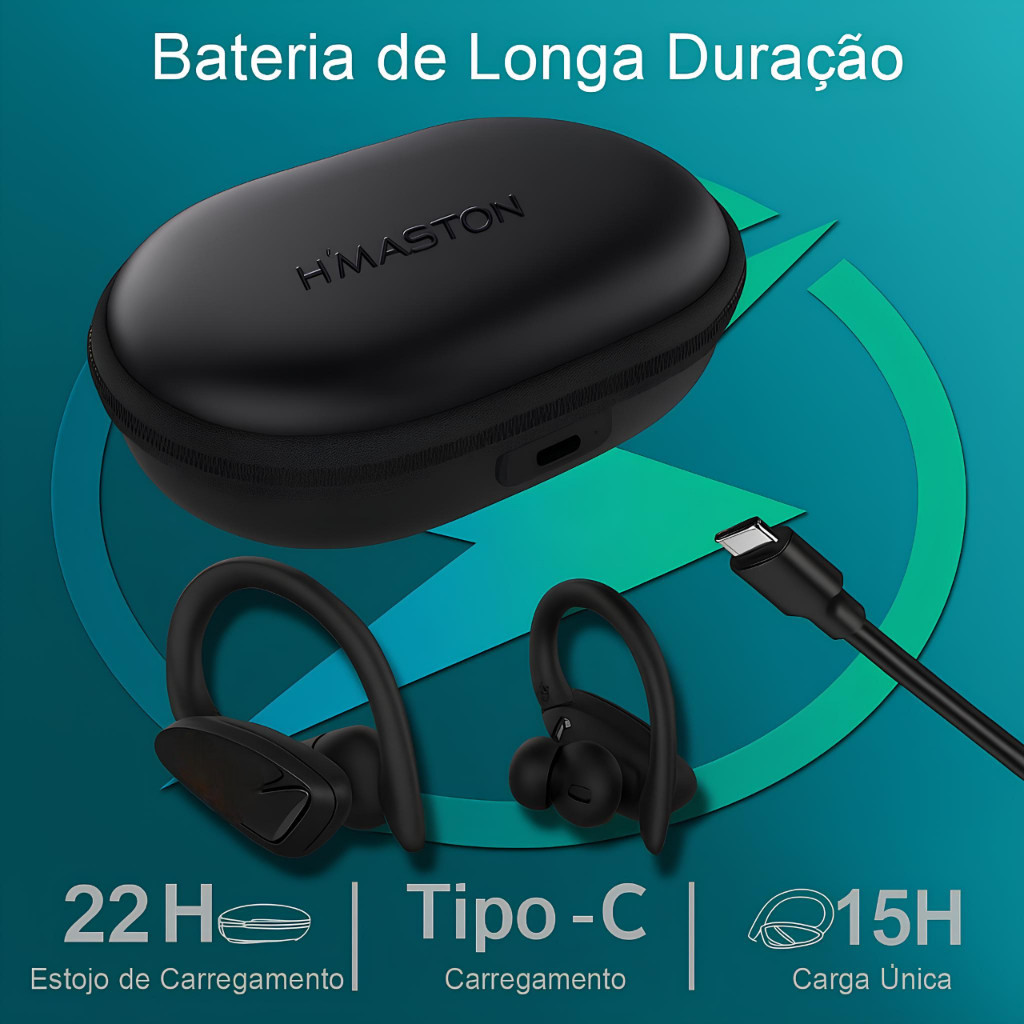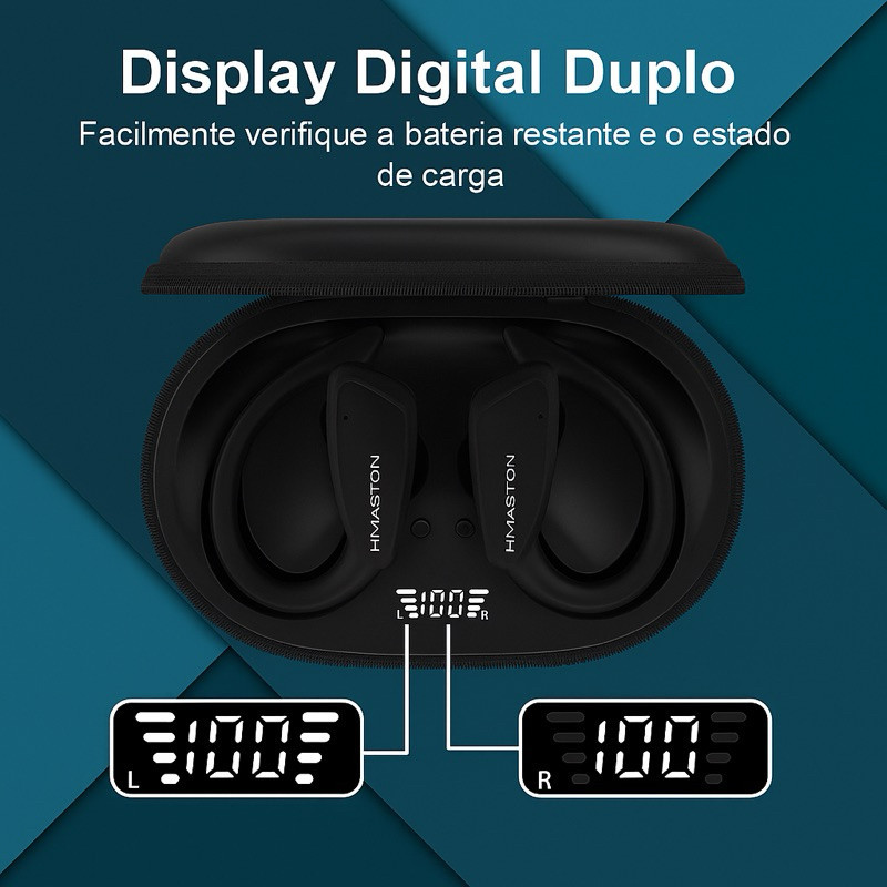 Fone de Ouvido Bluetooth Sem Fio Esportivo com Gancho 15h Bateria Display LED Cancelamento de Ruído