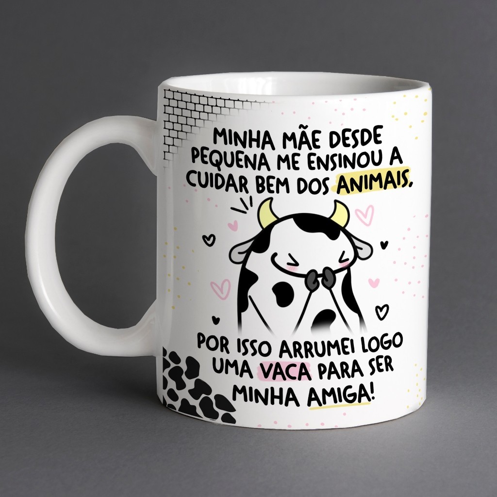 Caneca Humor Amigas 'Minha mãe desde pequena me ensinou a cuidar bem dos animais, por isso arrumei uma vaca para ser min