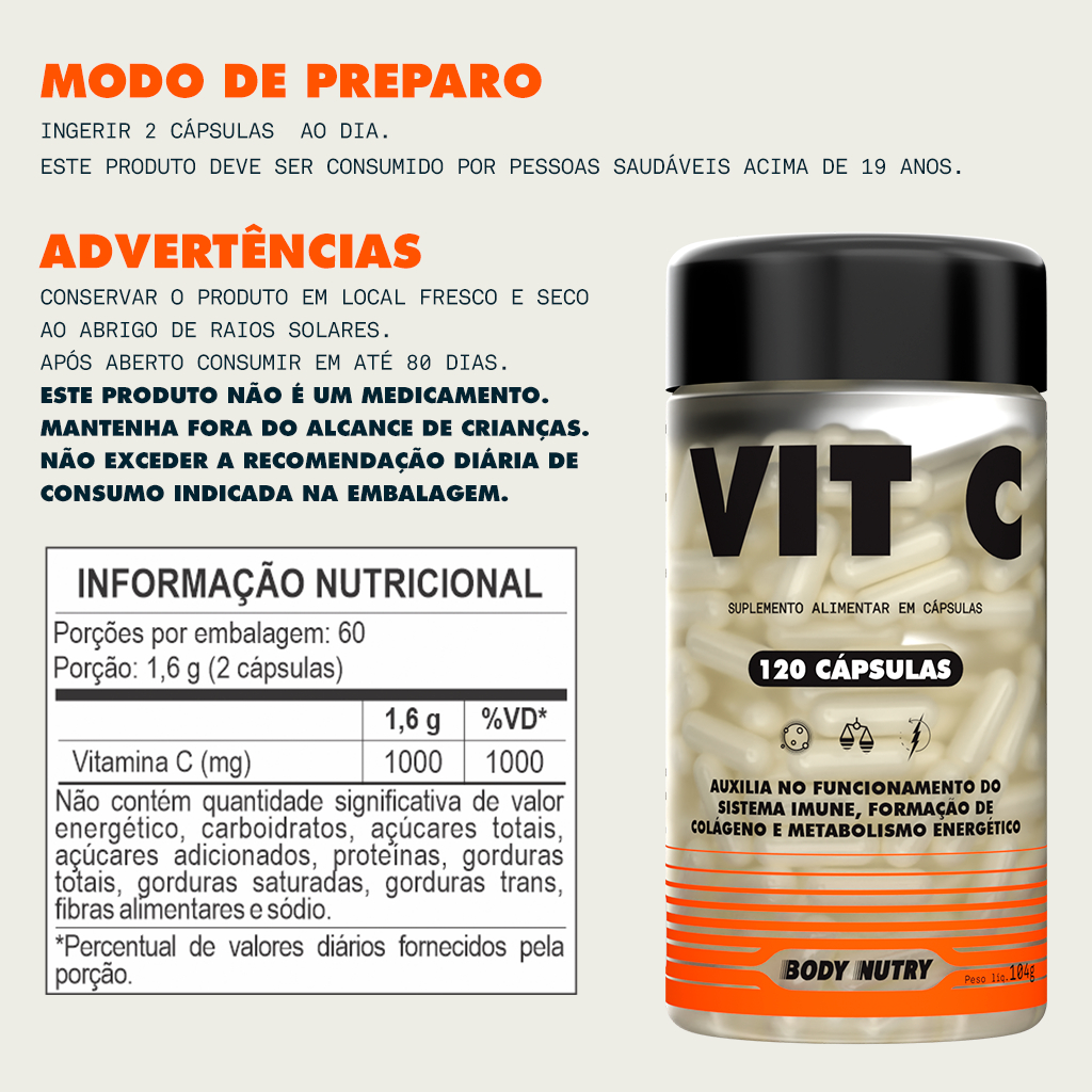 Vitamina C + Zinco + Vitamina D3 - 120 Cápsulas Body Nutry