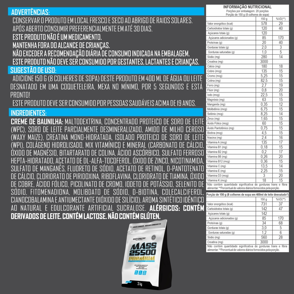 Hipercalórico Mass 25500 Premium, 3kg - Body Nutry