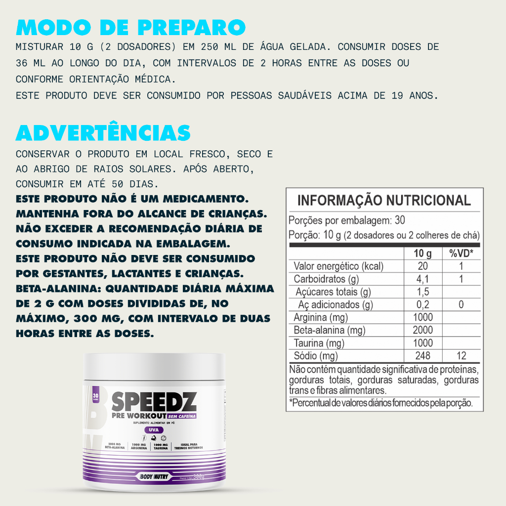 SpeedZ - Pré Treino sem Cafeína 2000mg Beta-Alanina e 1000mg de Arginina e Taurina - Body Nutry