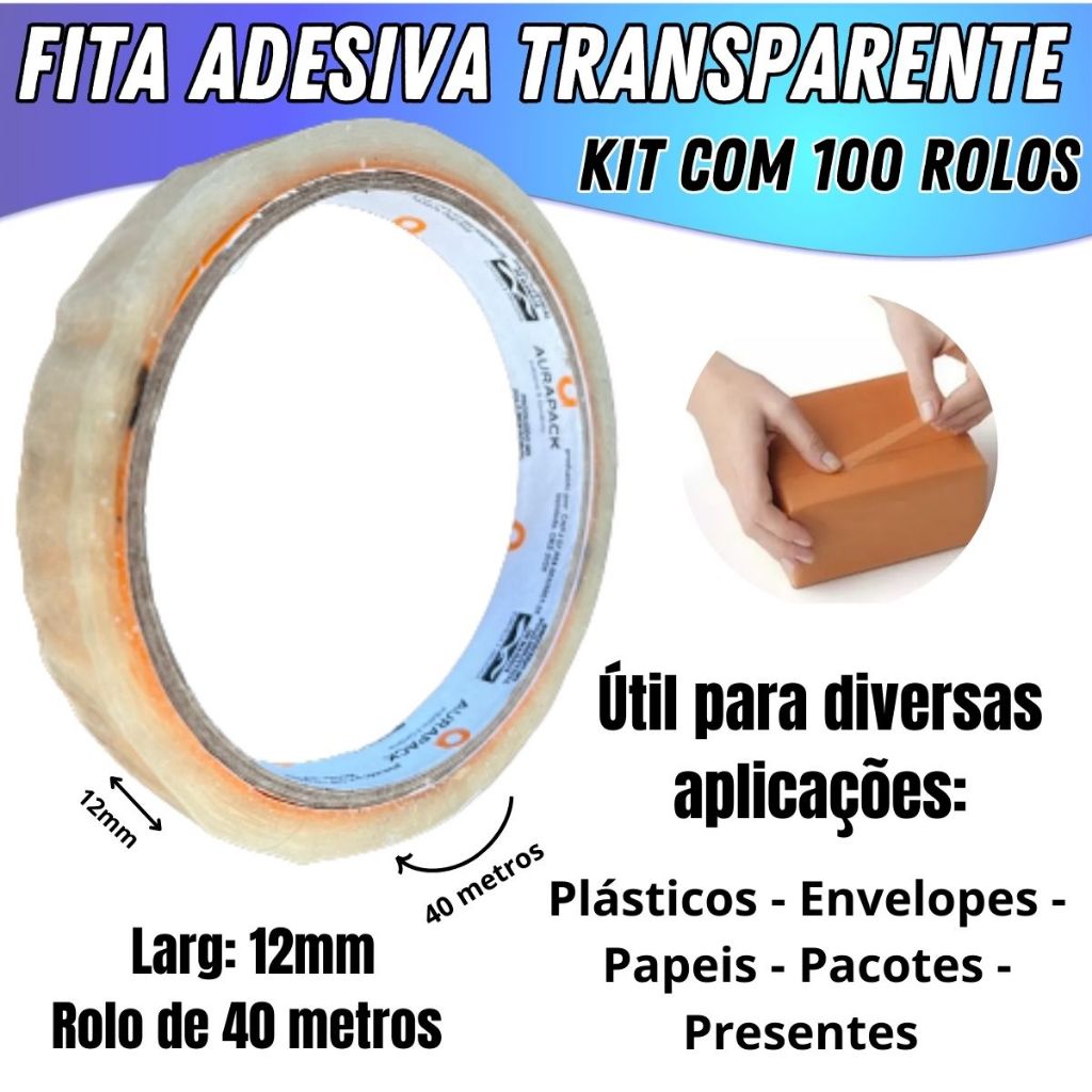 Kit com 100 Rolos Fita Adesiva Durex Fino Transparente 12mm X 40m