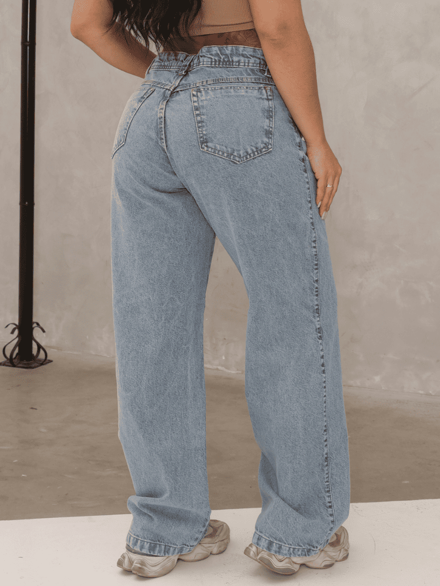 Calça Wide Leg Feminina jeans Cintura Alta Pantalona Marmorizada 100% Aldodão com 4 Bolsos Funcionais.