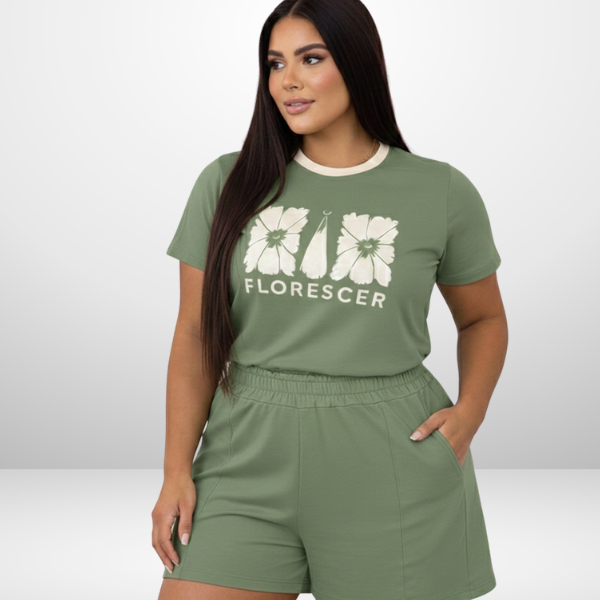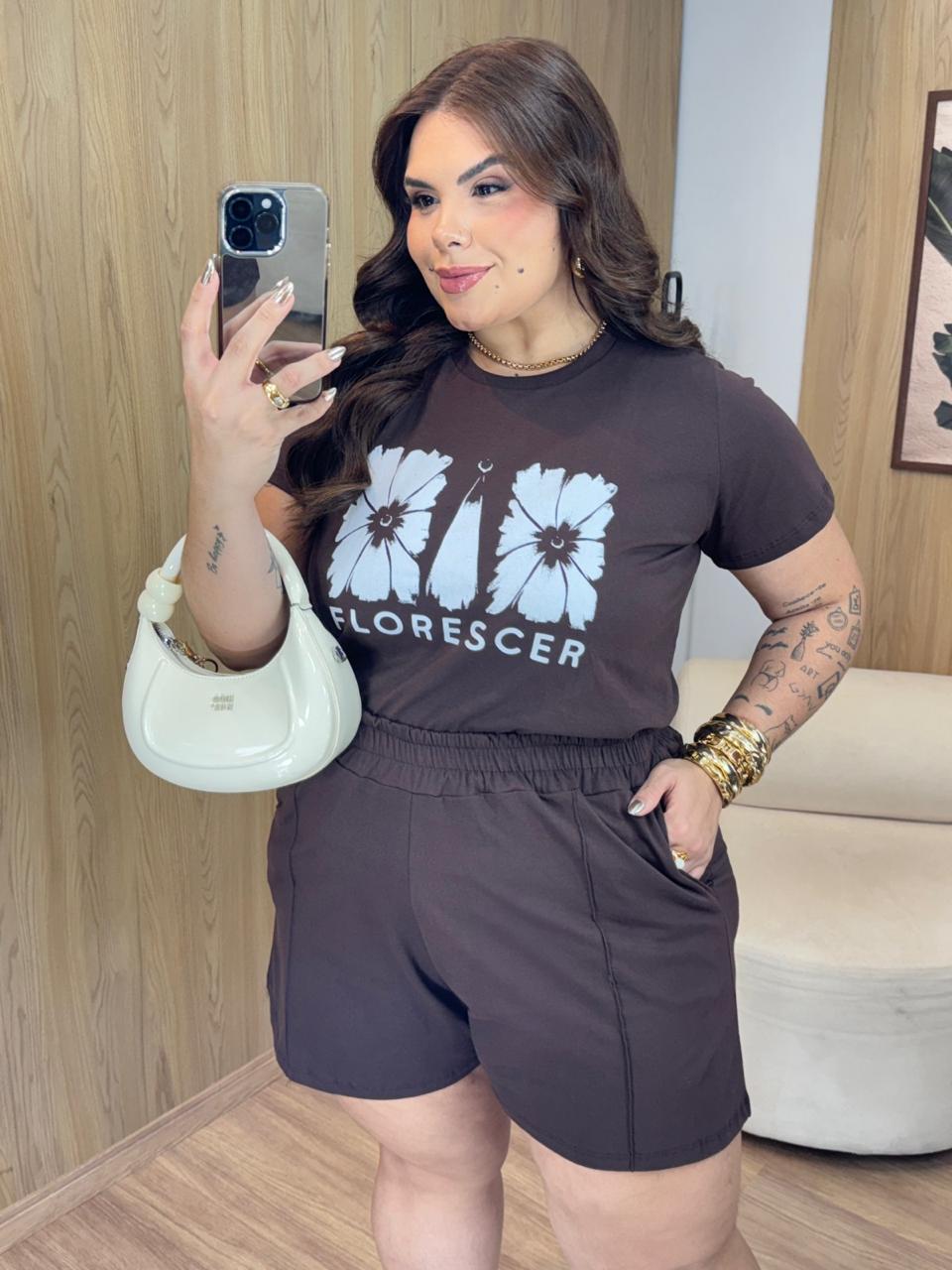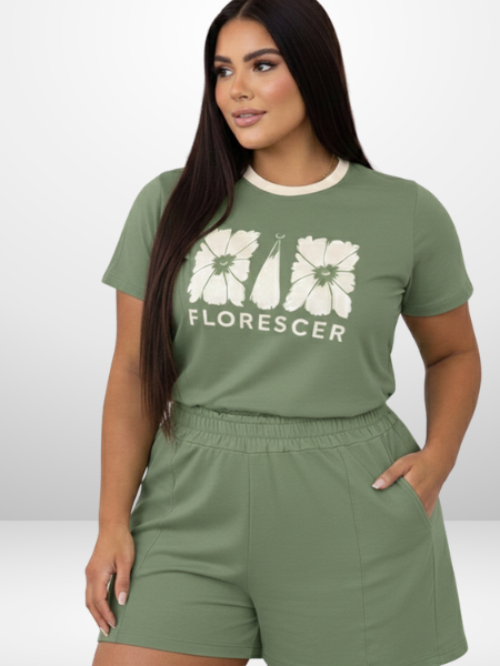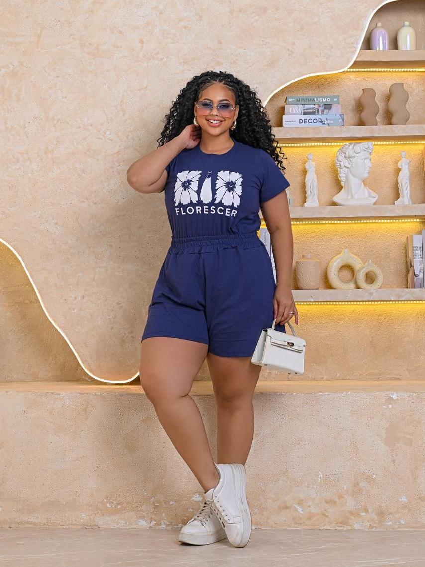 Conjunto Feminino Plus Size com Blusa T-shirt e Short Meia Coxa Malha 100% Algodão