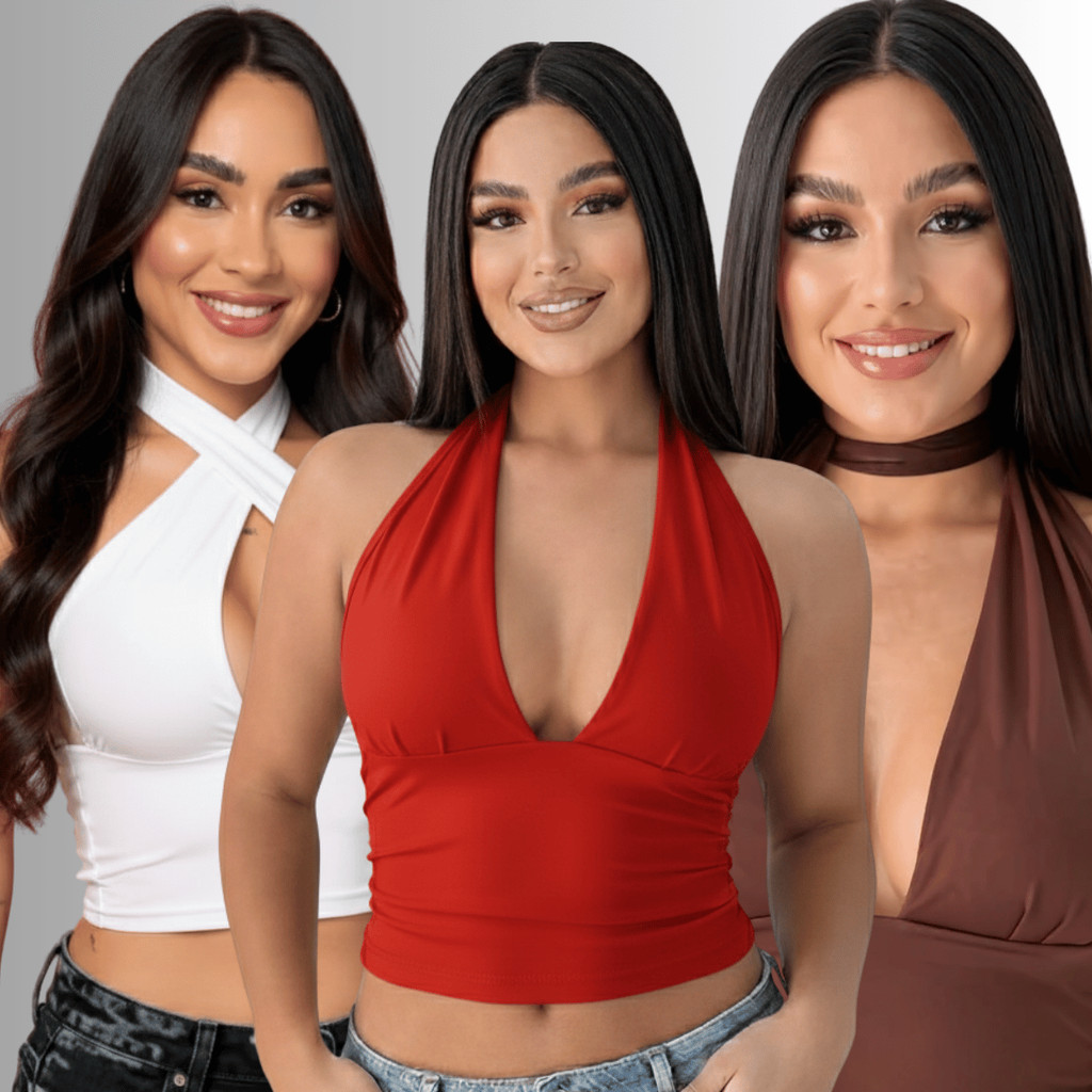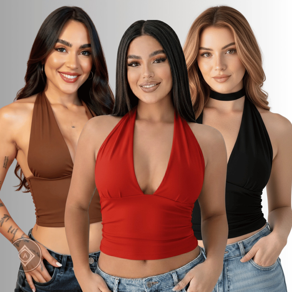 Kit 3 Top Blusas Cropped Com Amarraçao Multiformas Decote Forado Festa Moda Gringa Decotado Suplex Sexy Sustentaçao