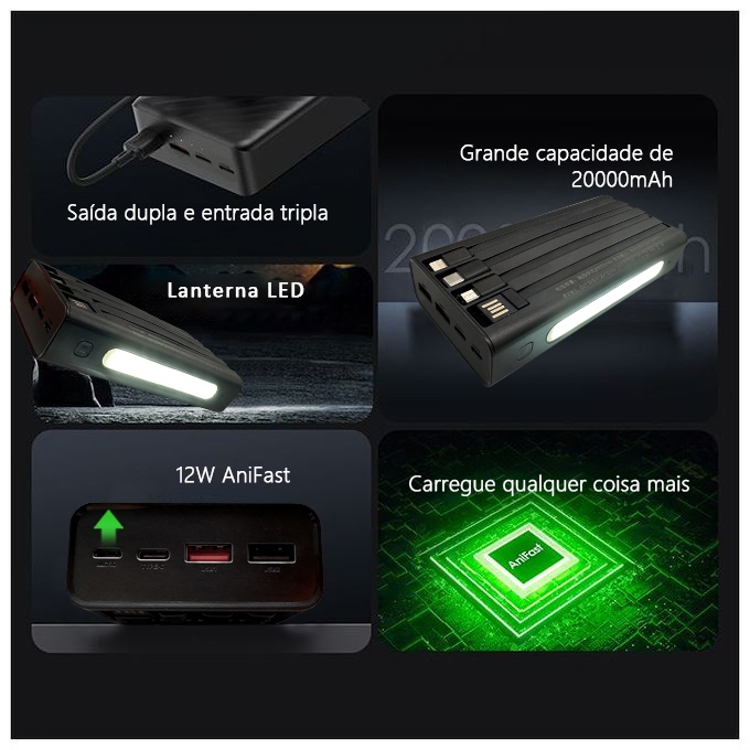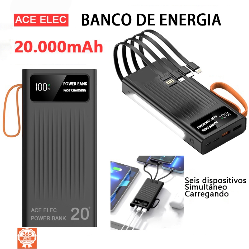YM571 Carregador Portátil 20000mAh Power Bank integrado com 4 cabos, lanterna LED e display digital,para iPhone/Android
