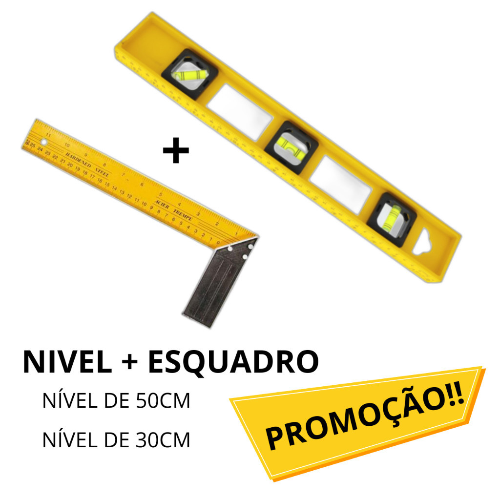 Esquadro Régua Carpinteiro Pedreiro Metálico Aço De 30cm Kit Profissional e Nível Polímetro Pedreiro
