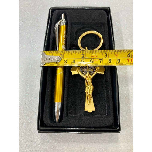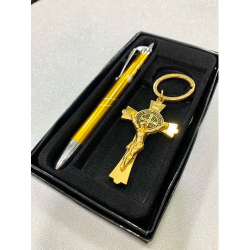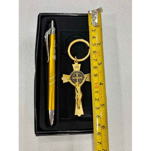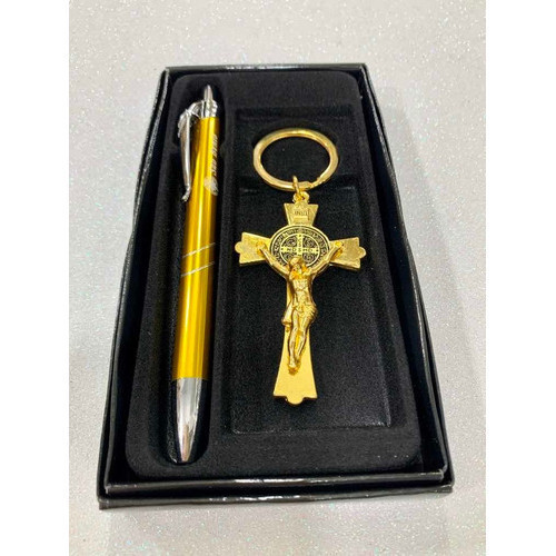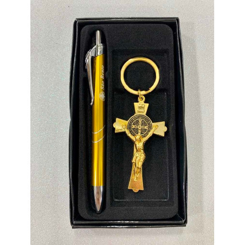 Caneta + Chaveiro Cruz Medalha De São Bento Dourado