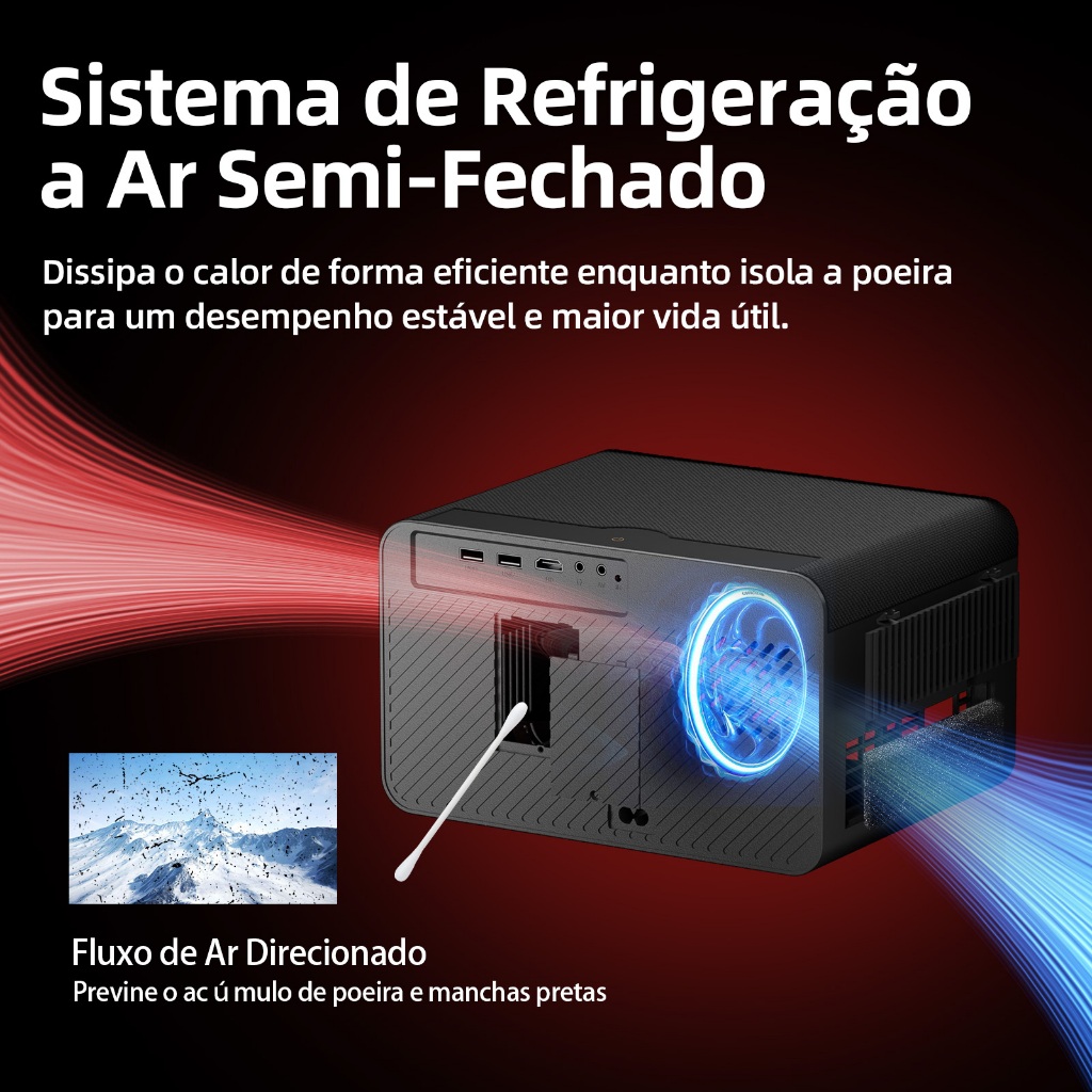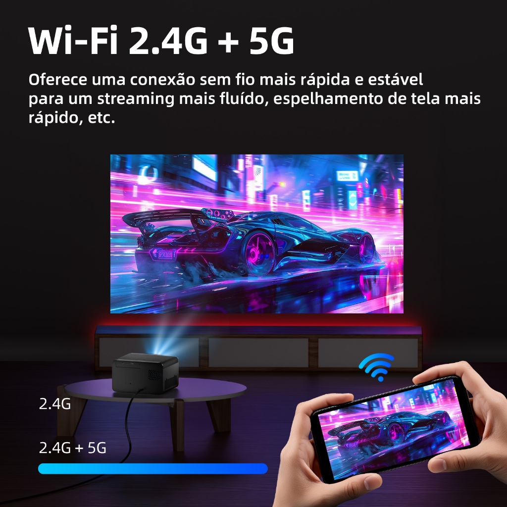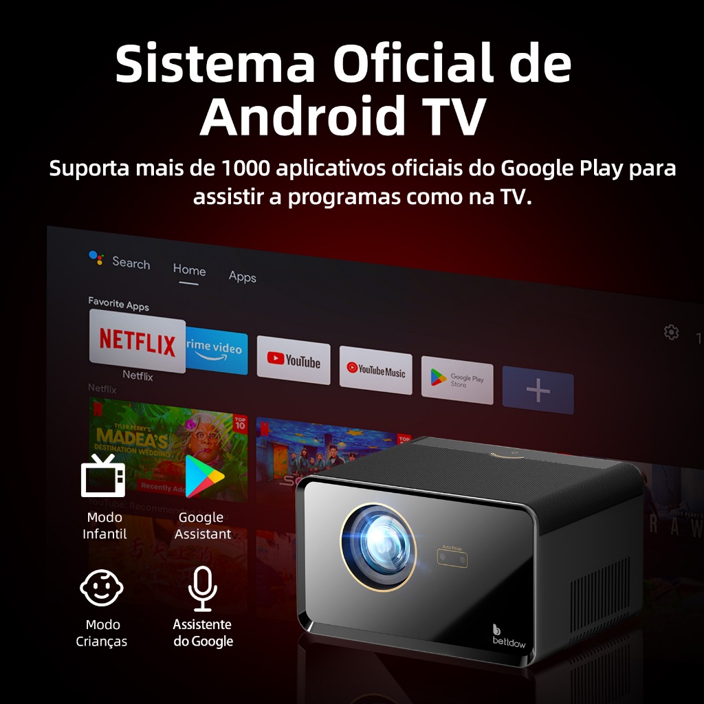 O projetor Bettdow Netflix 4K HD possui 600ANSI de brilho e é compatível com foco automático do Google TV e áudio