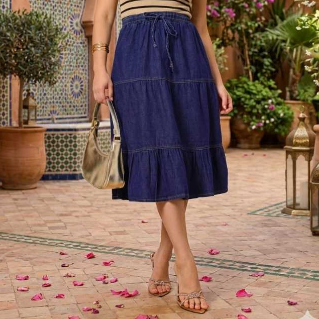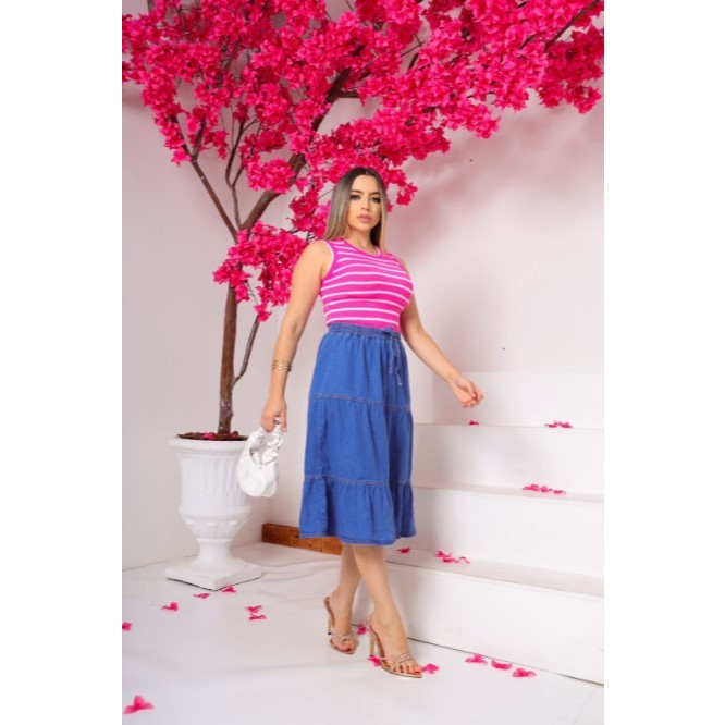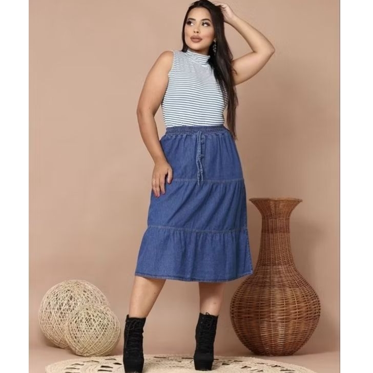 Saia Jeans Evangélica 3 Marias Midi com Elastico na Cintura Moda Evangélica Legal pra Este Verão