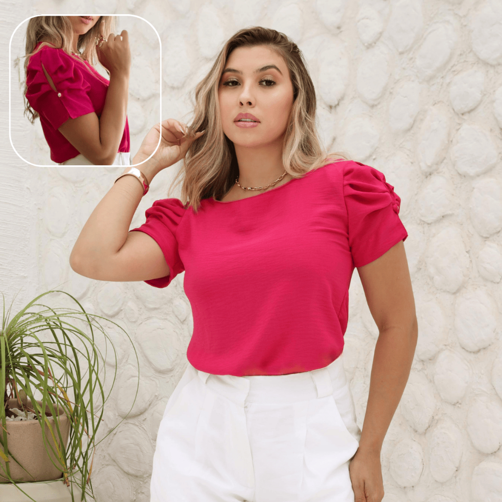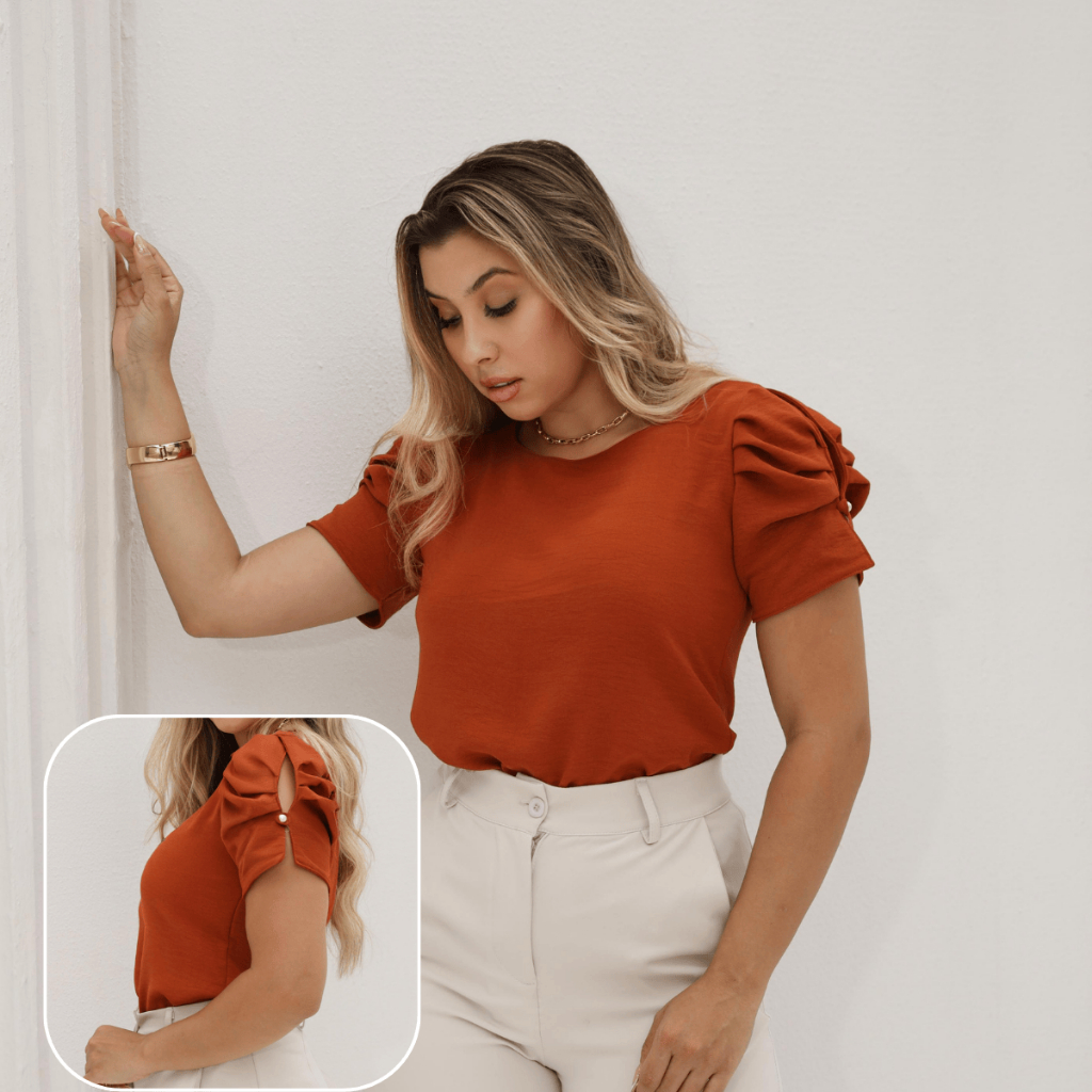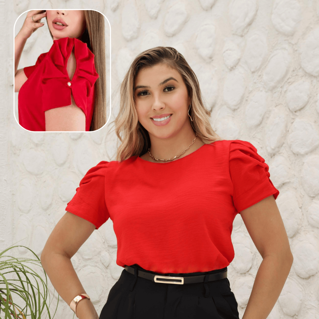 Blusa Manga Princesa Curta Elegante Tendência Moda Maior Plus Size Botão Moda Casual Tecido Dunas