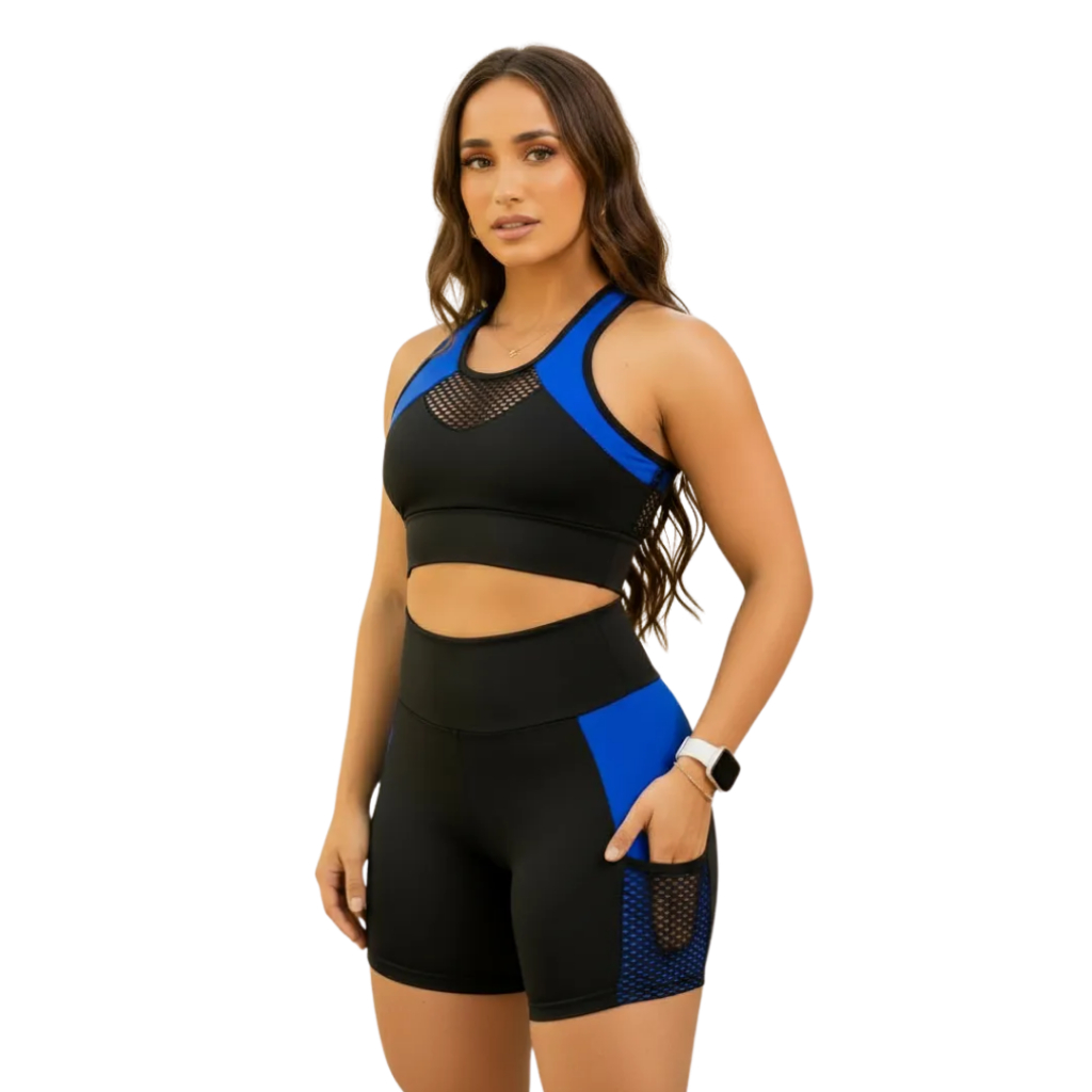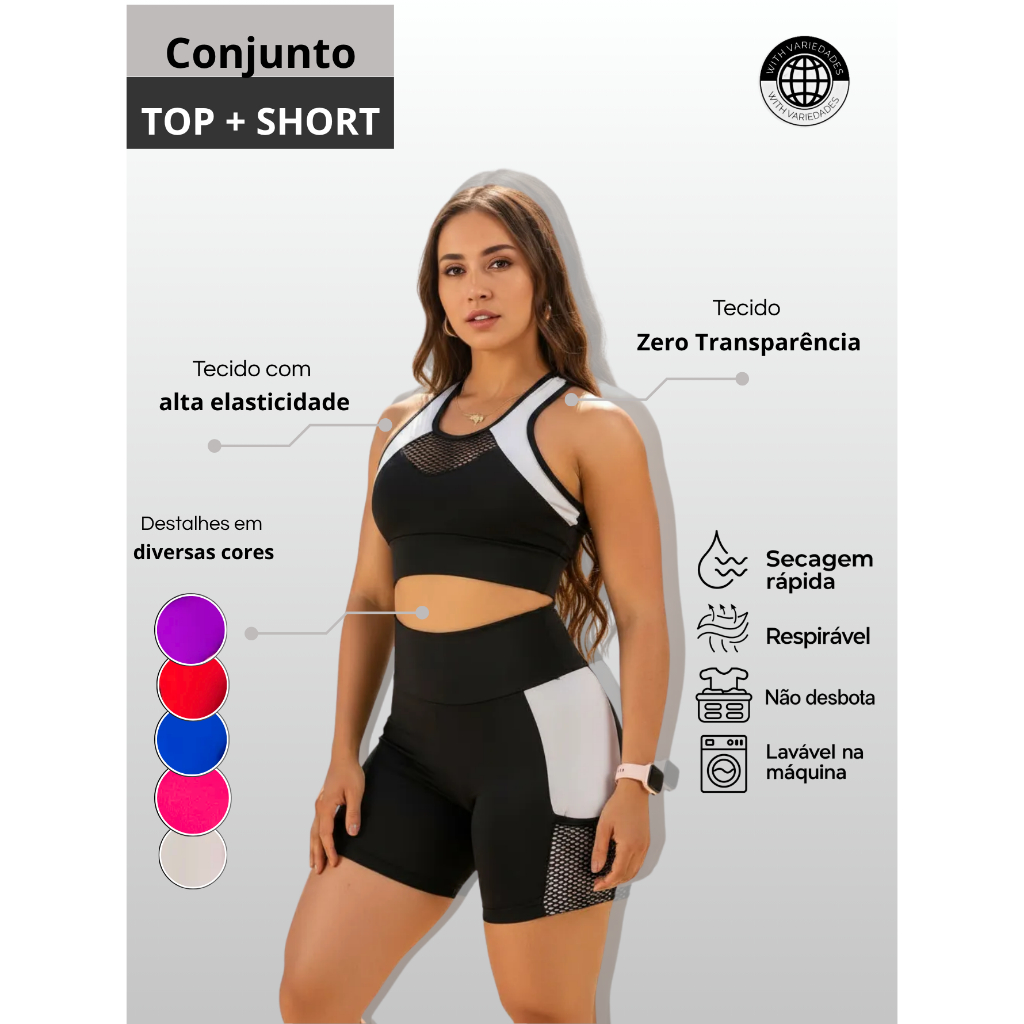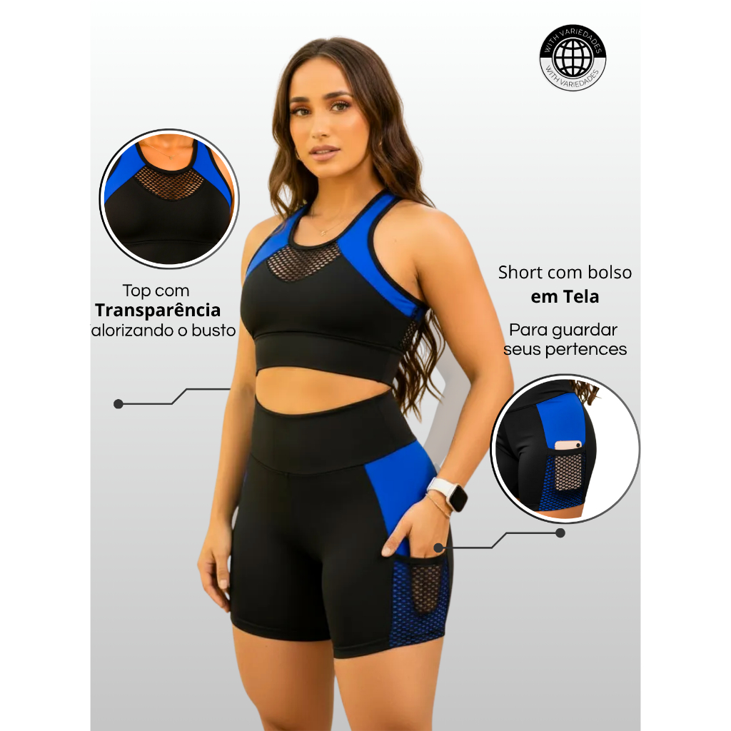 KIT 3 Conjunto Fitness Feminino Top + Short Cós Alto Roupa de academia Feminina Cropped Ginastica