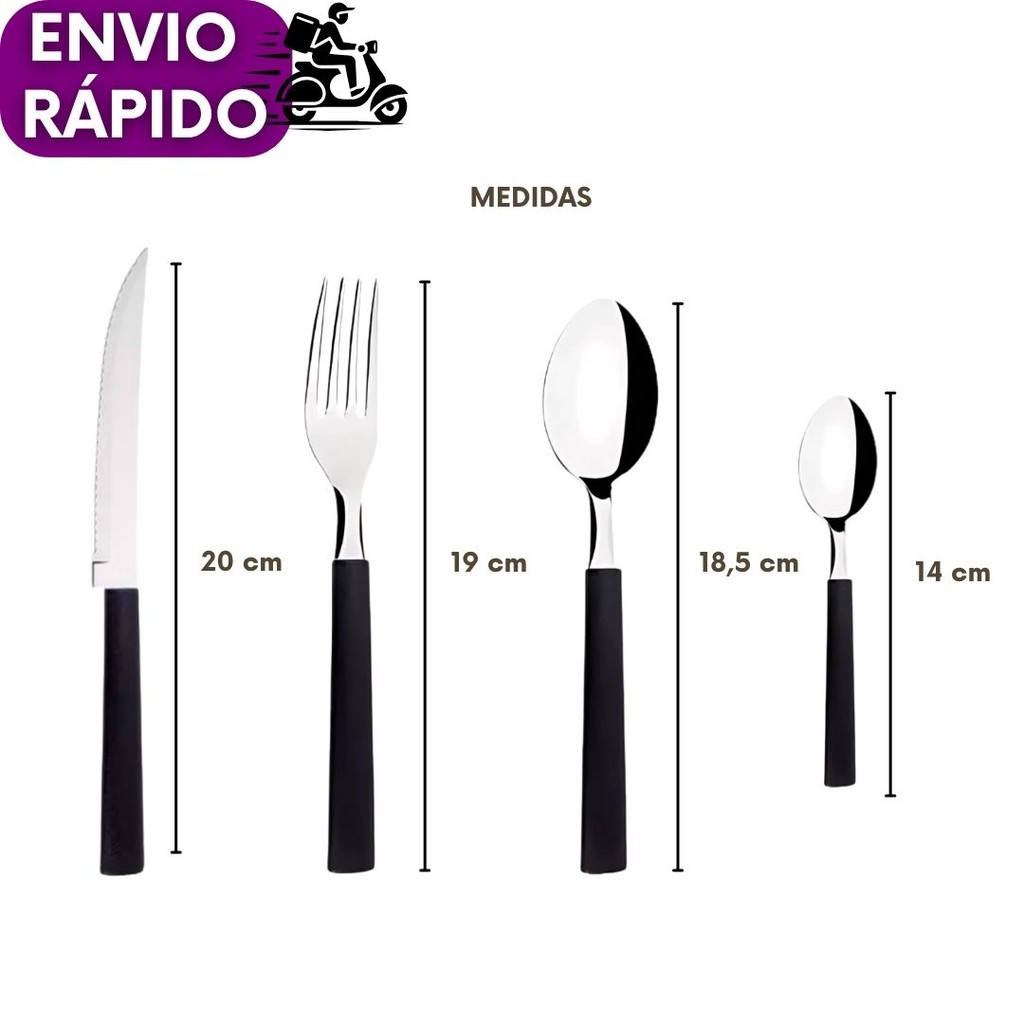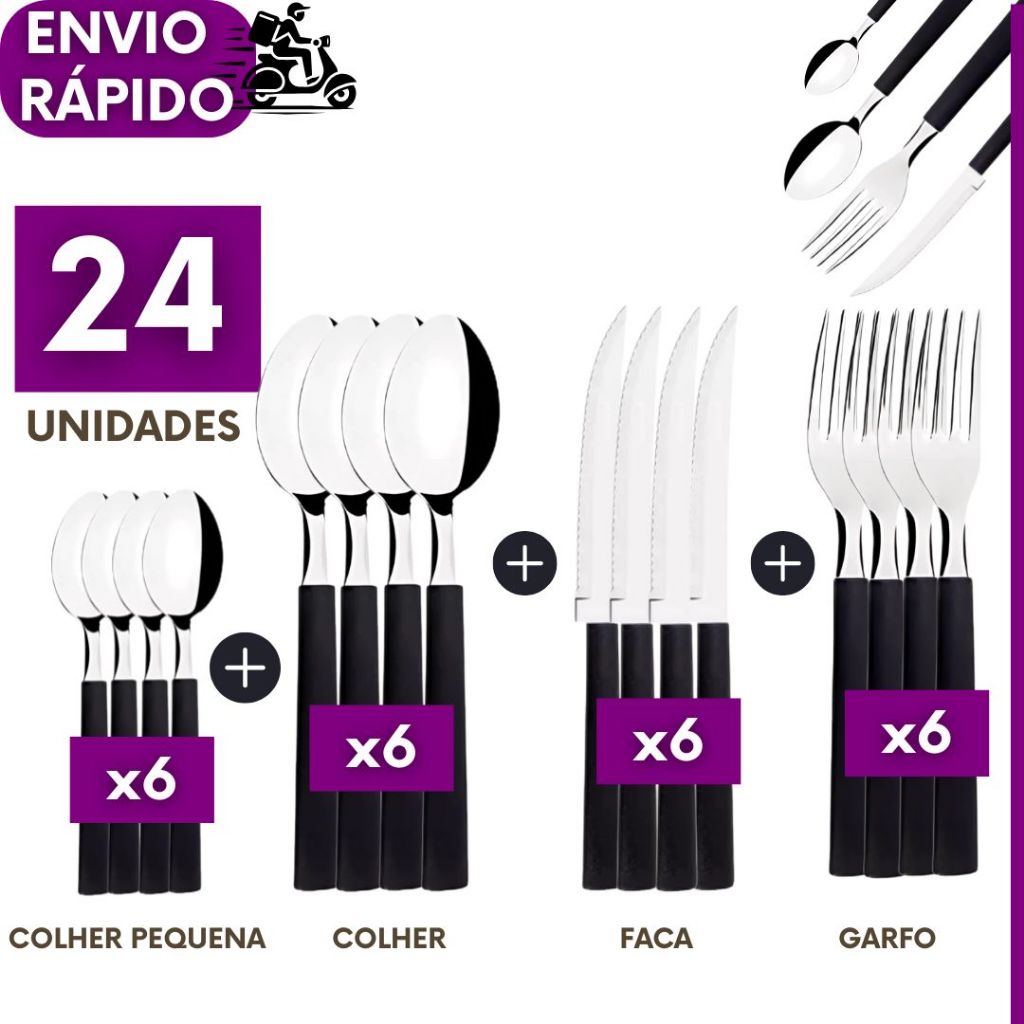 Kit 48, 24 ou 16 Talheres Faqueiro Colher Garfo Faca Colher de Chá Inox Cabo Preto