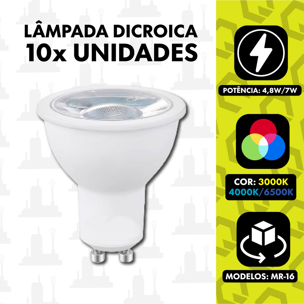 kit 10 Lampada Dicroica Led 4,8w/7w Mr16 Gu10 bivolt 3000k 4000k 6000k Para Spot LED FACTORY