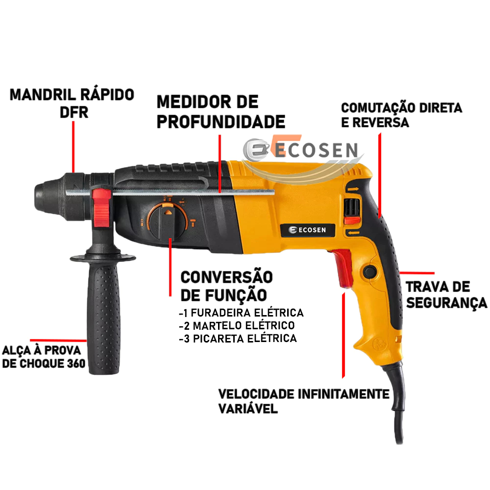 Martelete Rotativo Rompedor 800W 8Peças Furadeira De Impacto Potente + Maleta Acessórios
