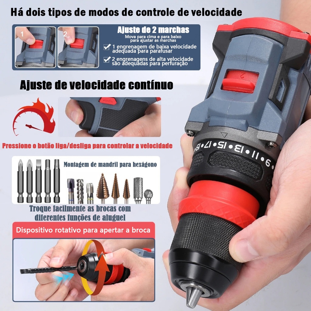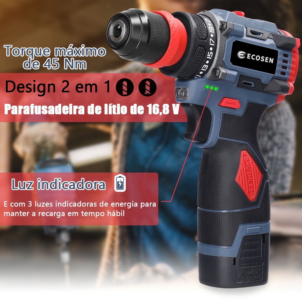 Parafusadeira elétrica 2 Bateriascom furadeira de lítio 2 em 1 de 16,8 V e torque de 45 Nm com motor sem escova 2 Bater