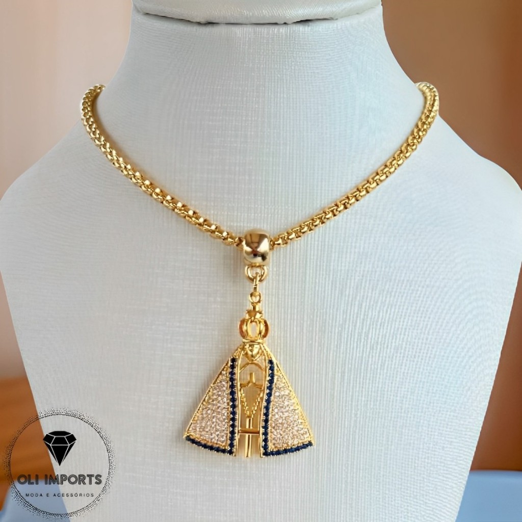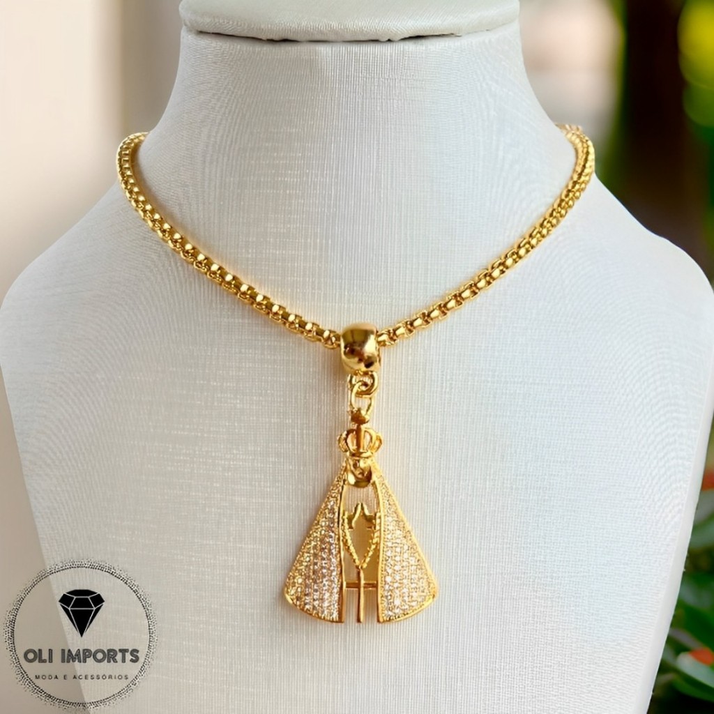 Colar Nossa Senhora Semi Joias Cravejado Correntaria Banhada A Ouro 18k Elegante Alto Brilho