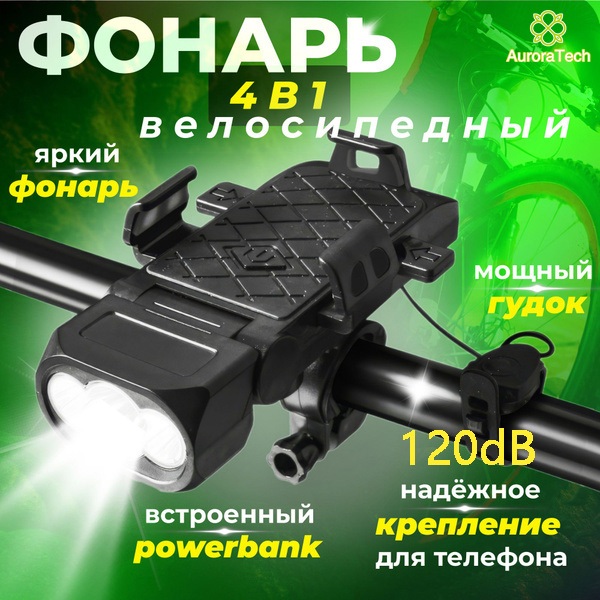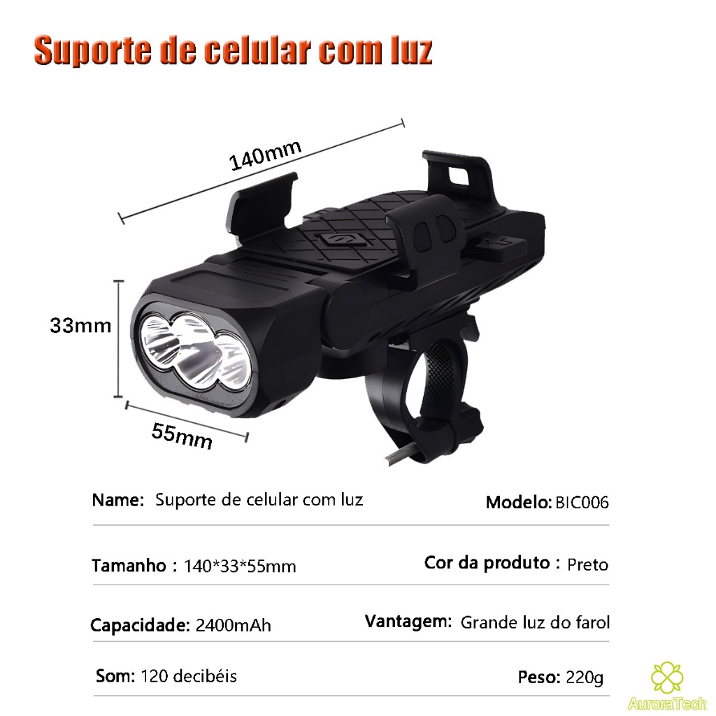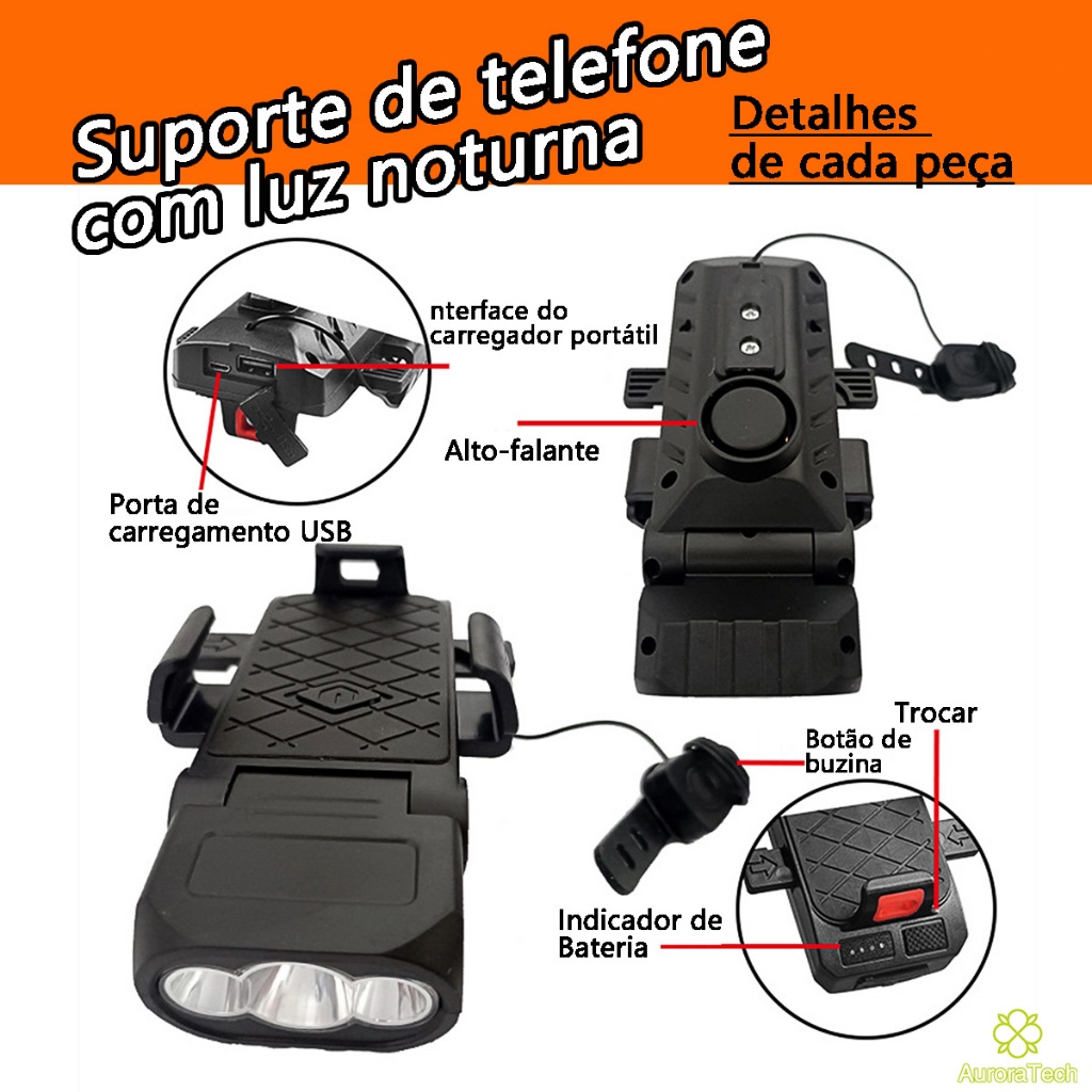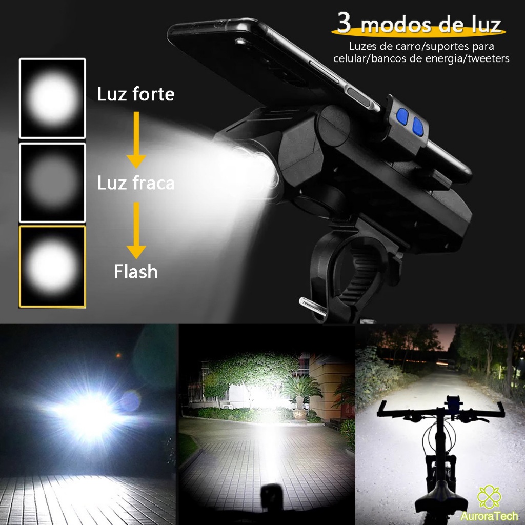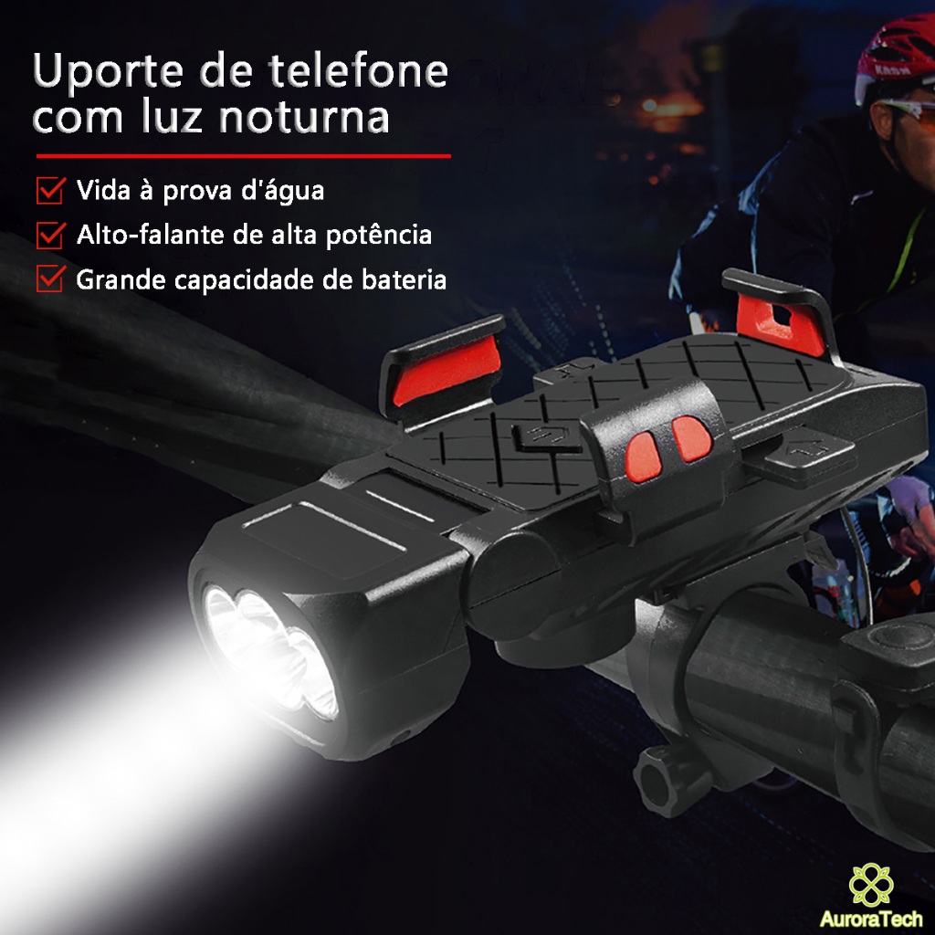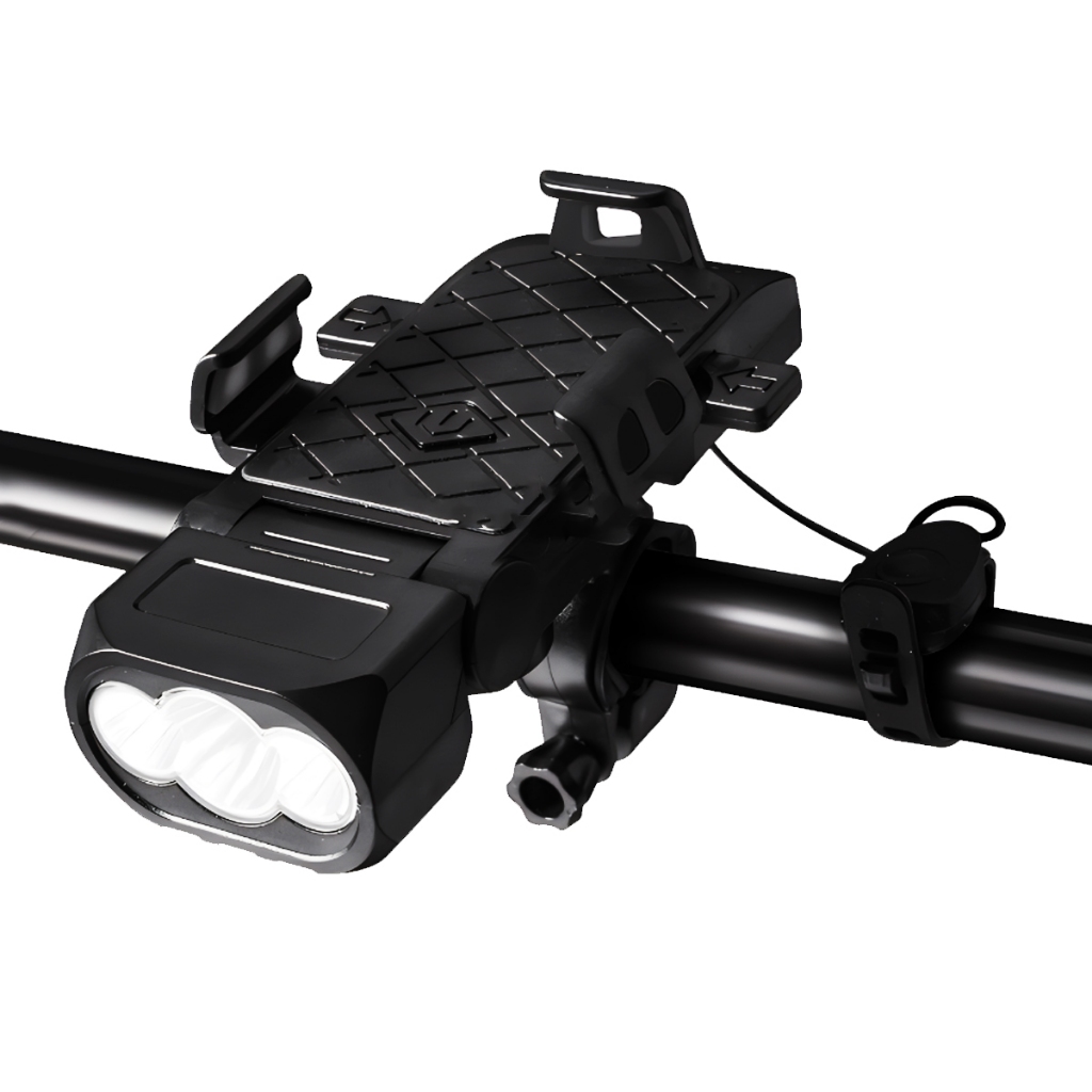 Lanterna Bike Com Buzina E Suporte De Celular 4 Em 1 Multifuncional Farol De Bicicleta Recarregável Luz De LED BIC006