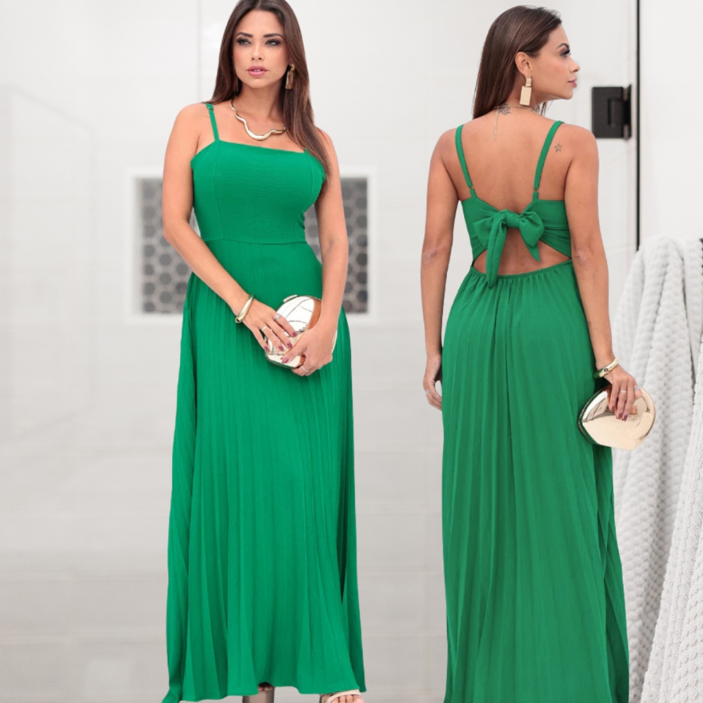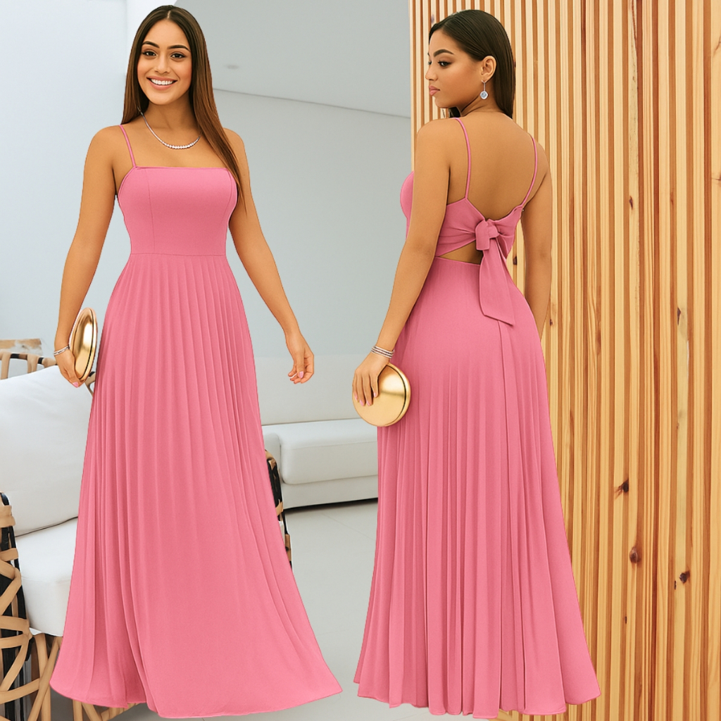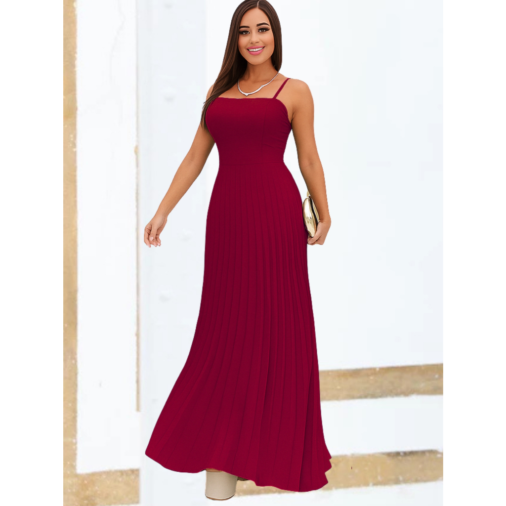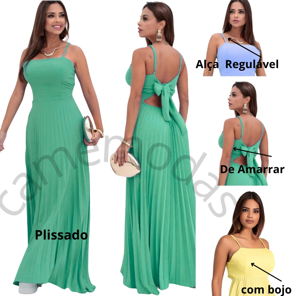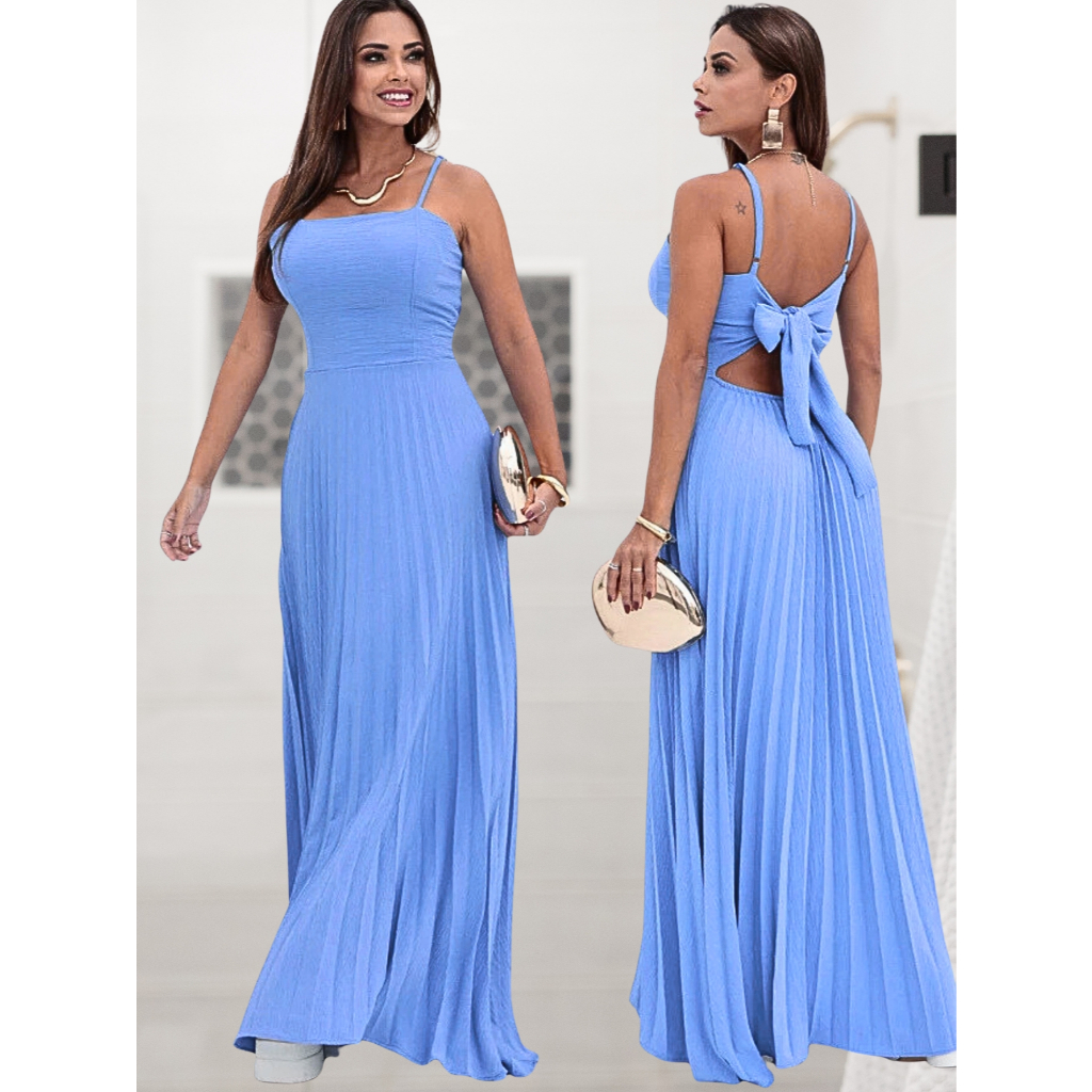 Vestido Plissado Feminino Alças Regulável Forrado Com Bojo Tecido Duna
