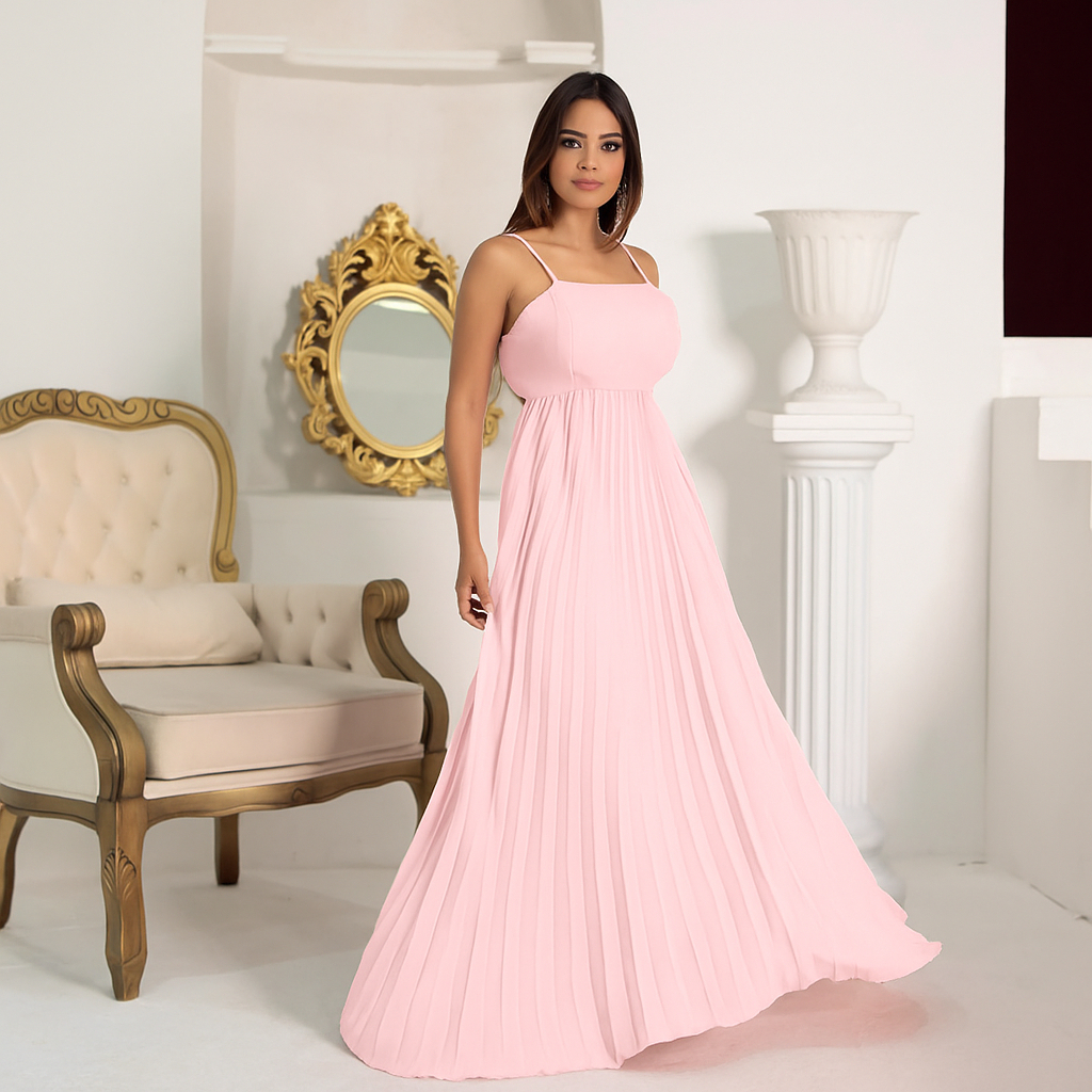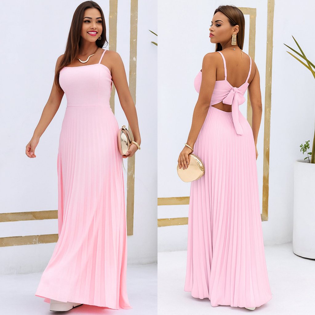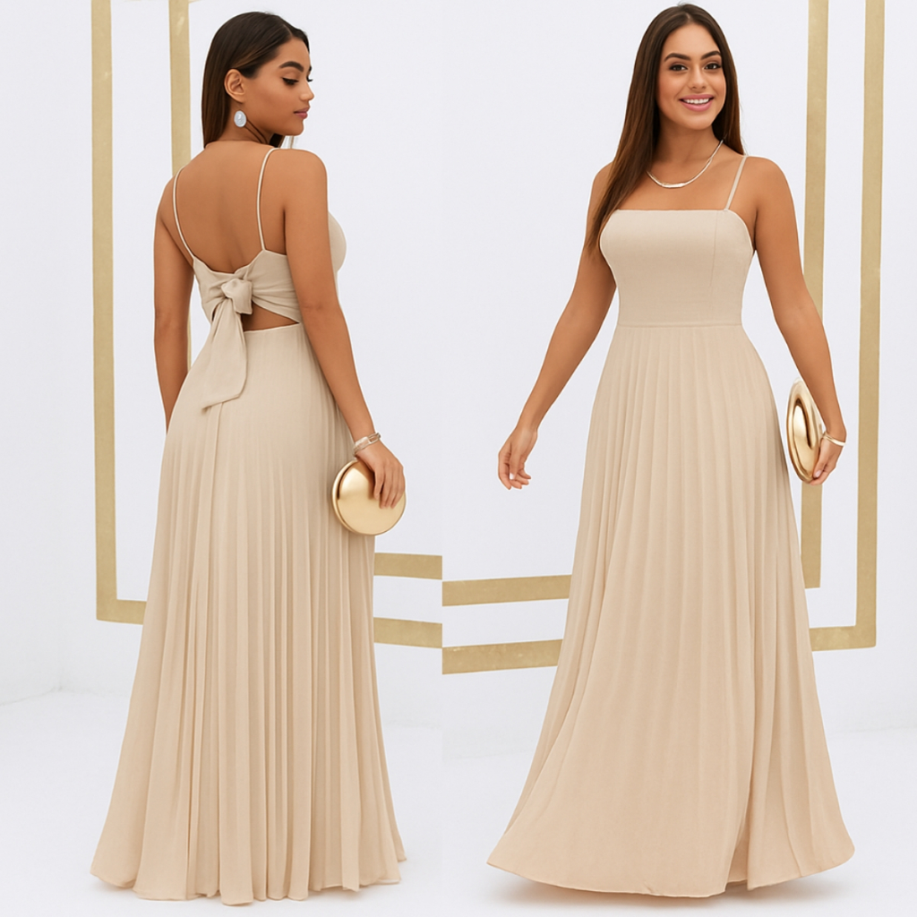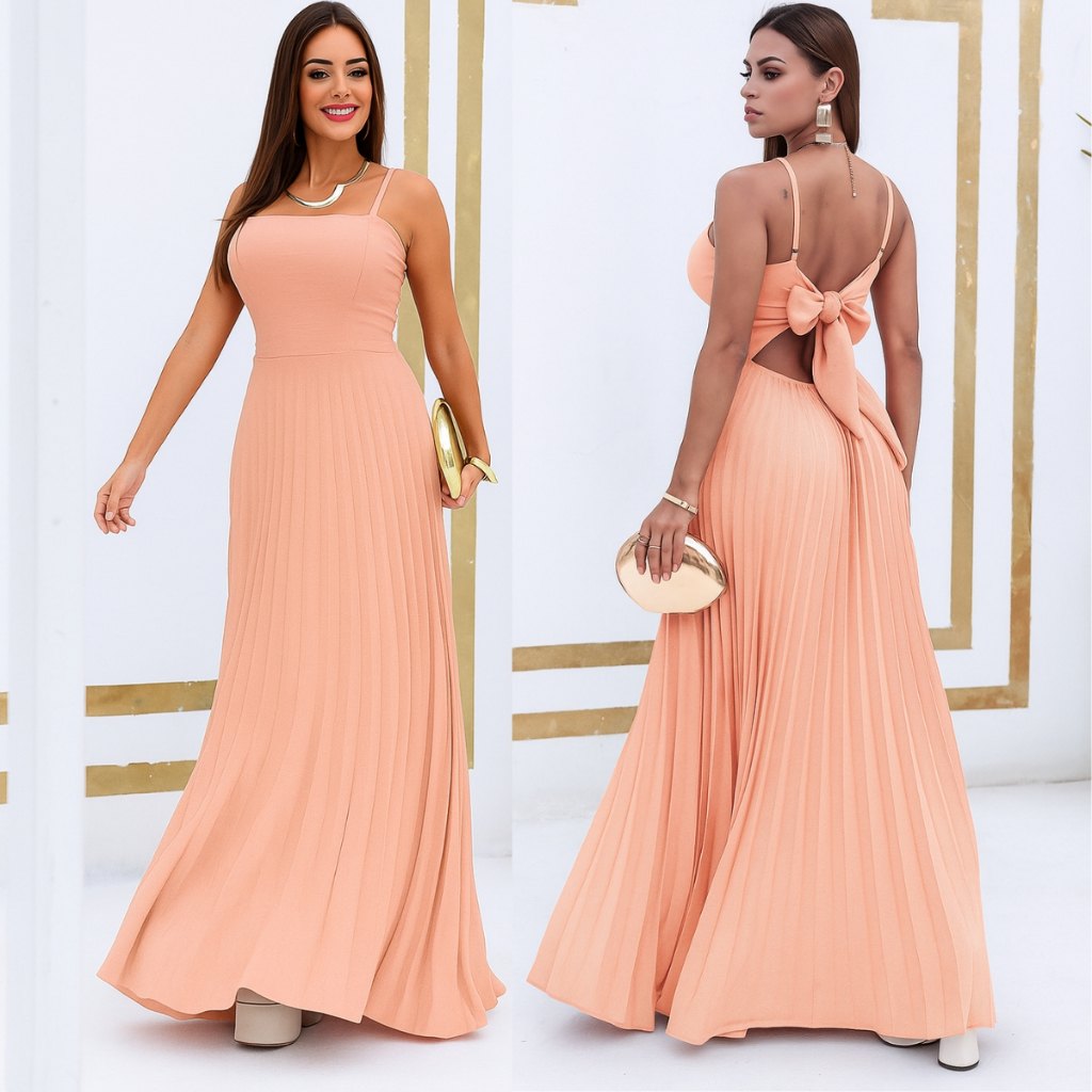 Vestido Plissado Feminino Alças Regulável Forrado Com Bojo Tecido Duna