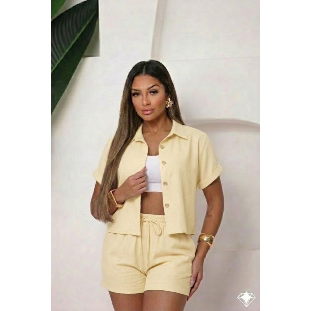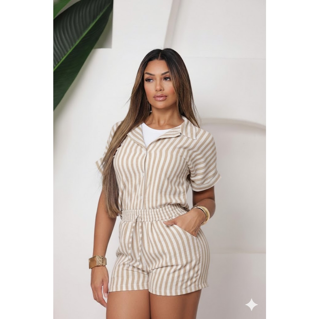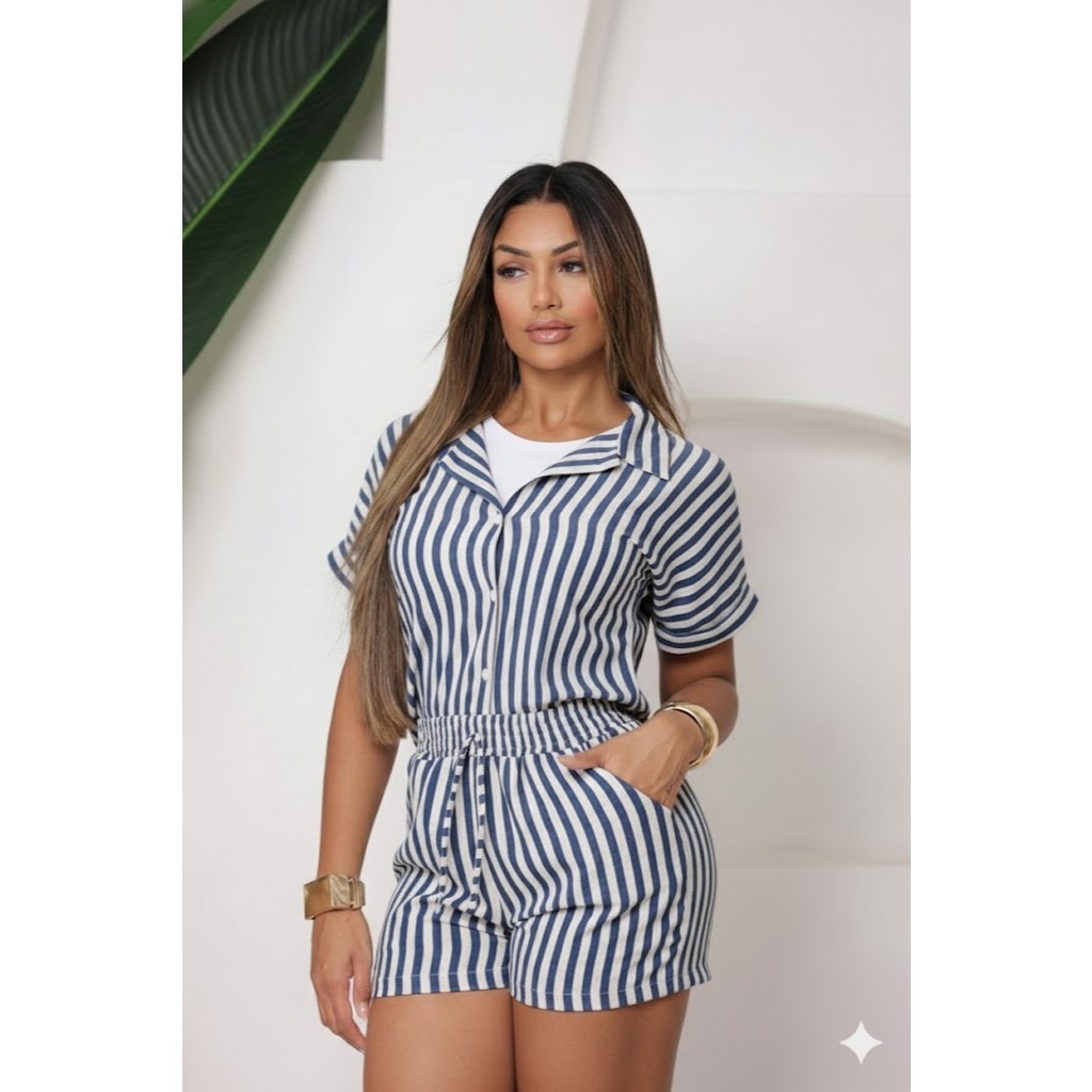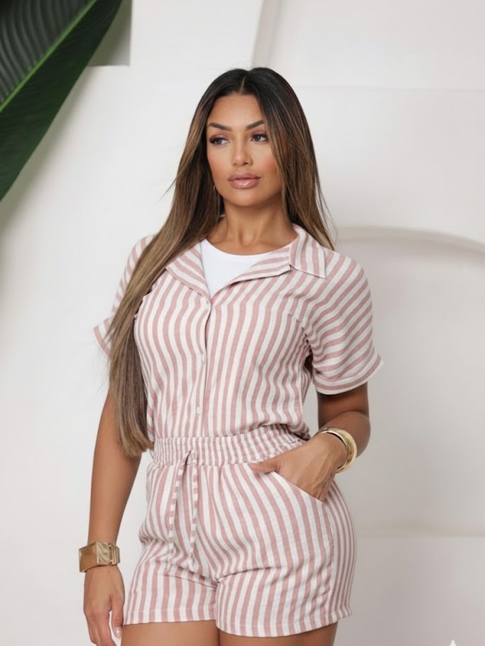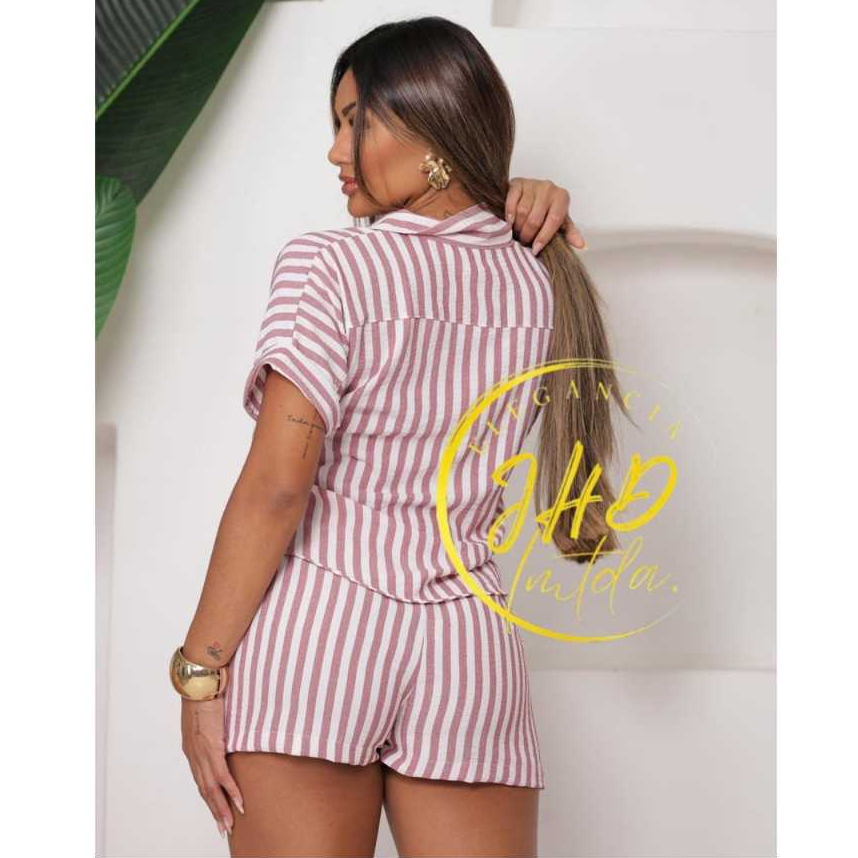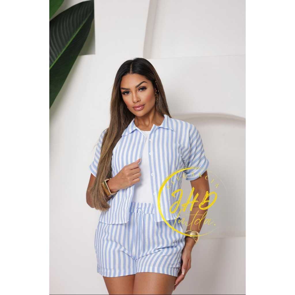 Conjunto Femenino Blusa com gola botão e short com bolso LISO e LISTRADOS.