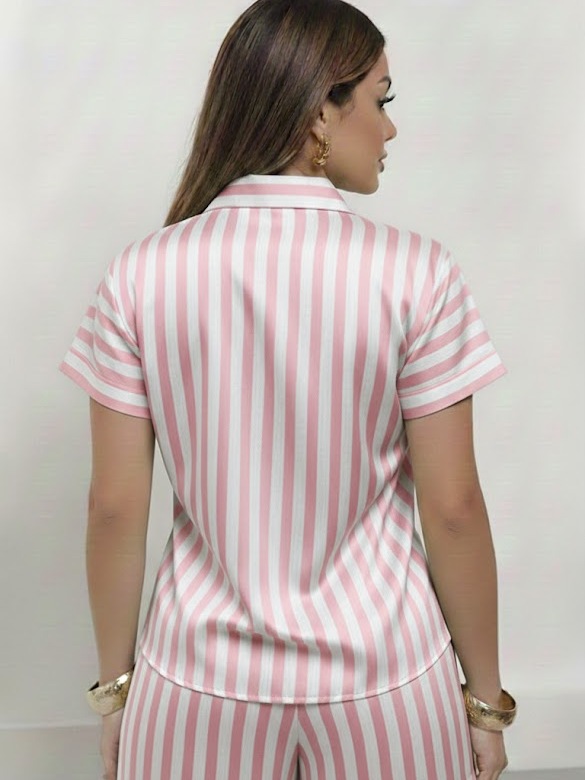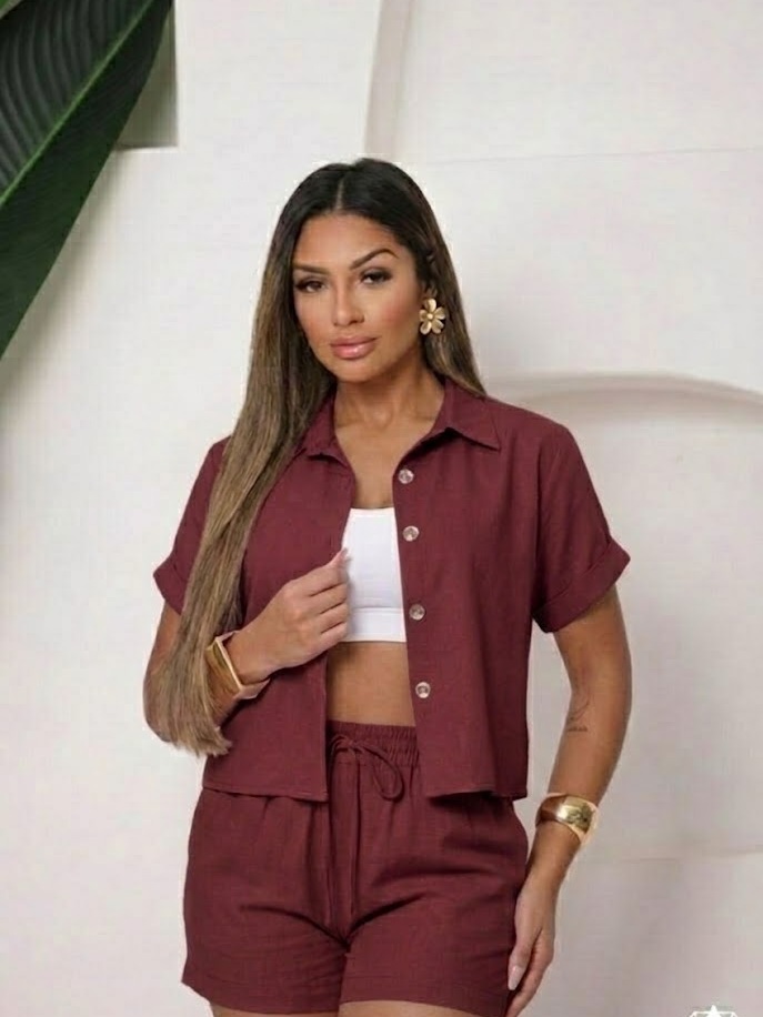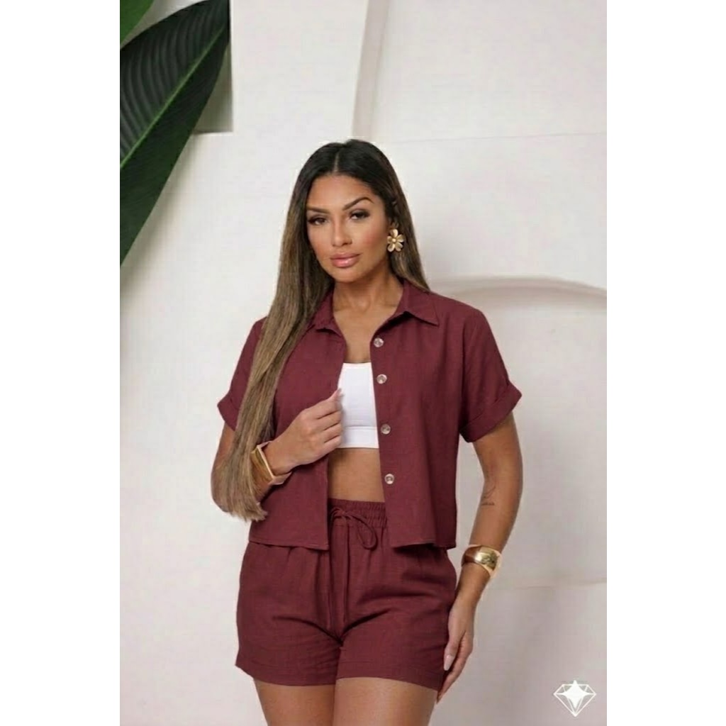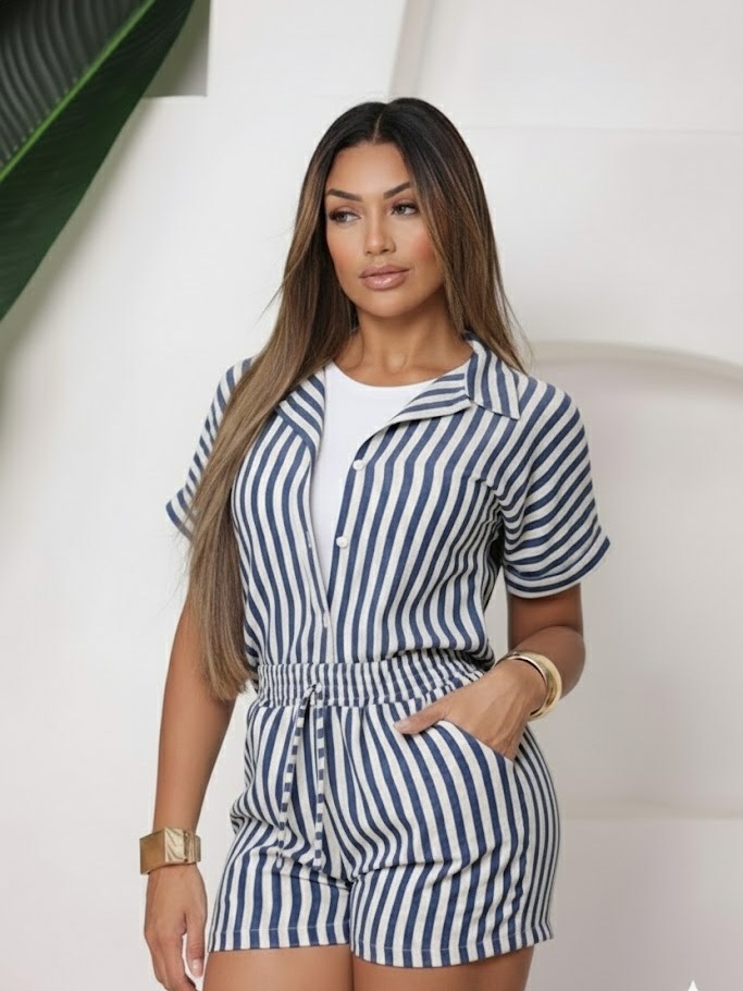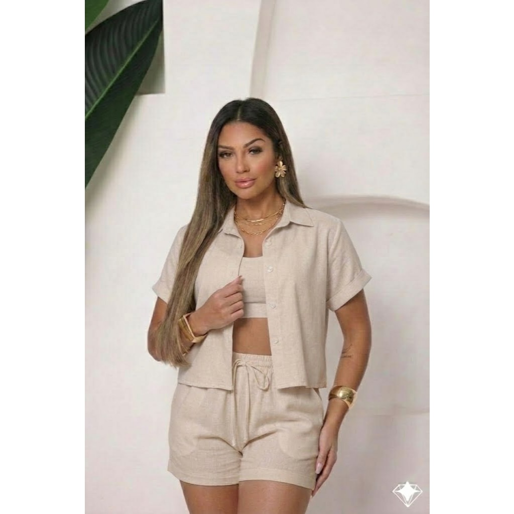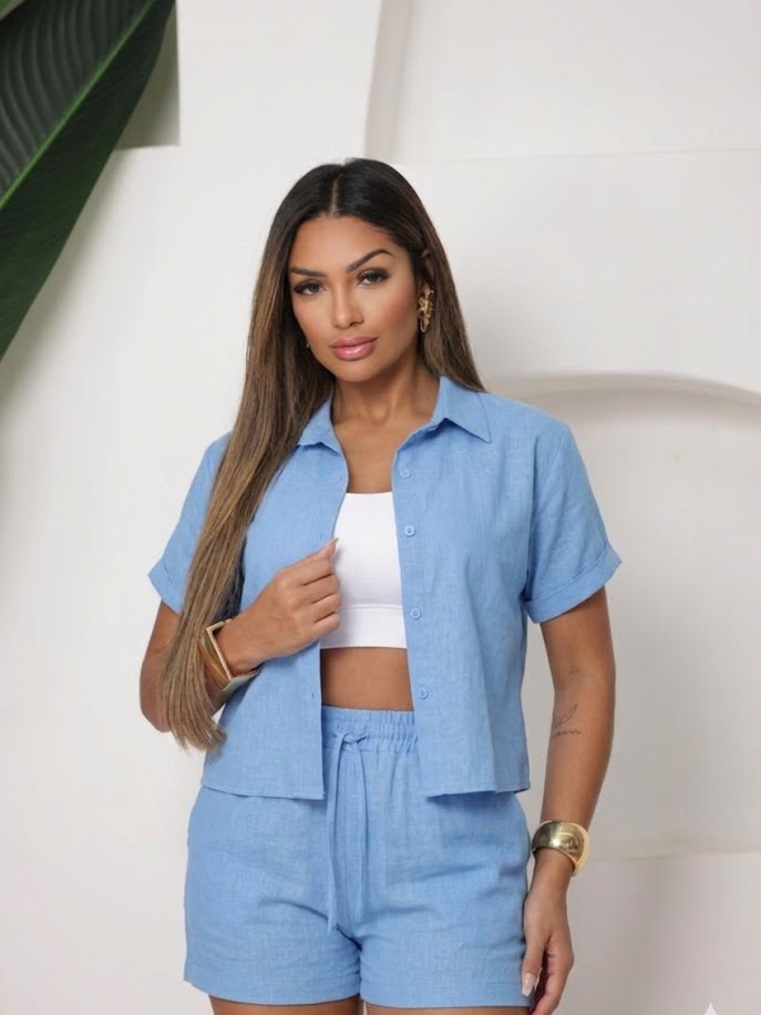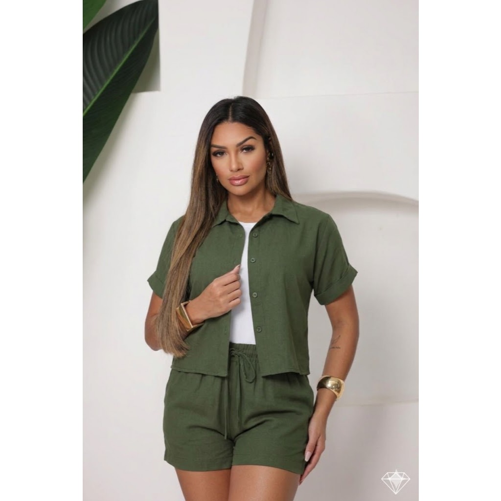 Conjunto Femenino Blusa com gola botão e short com bolso LISO e LISTRADOS.