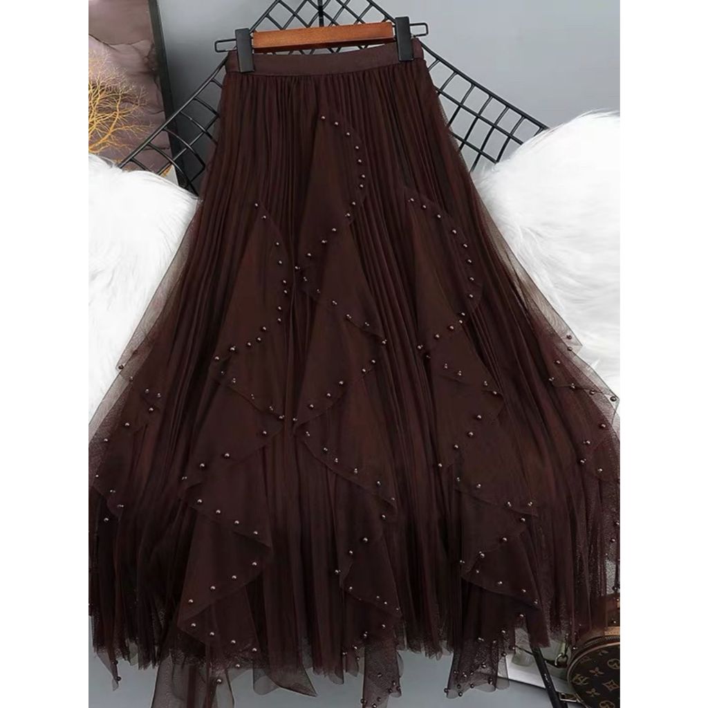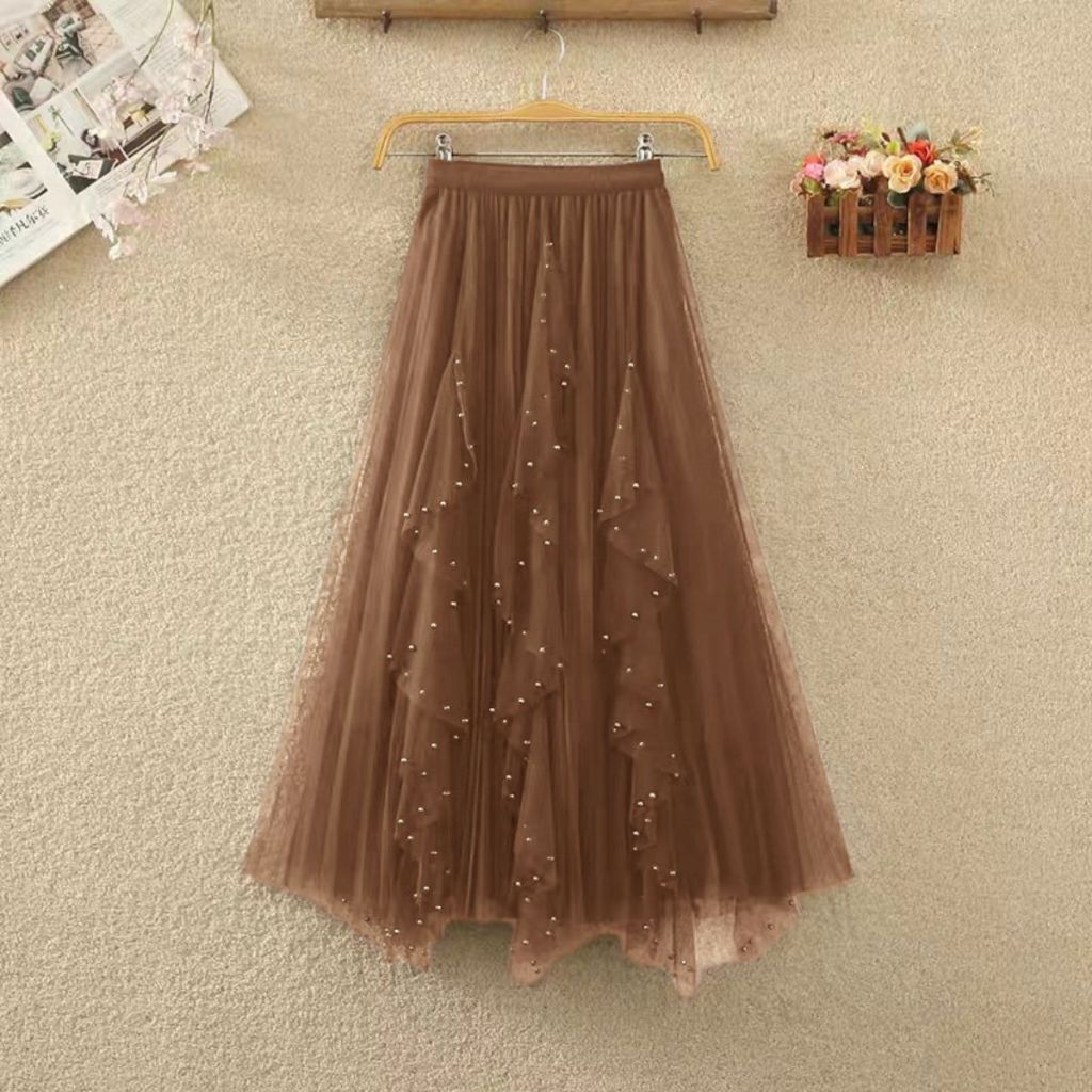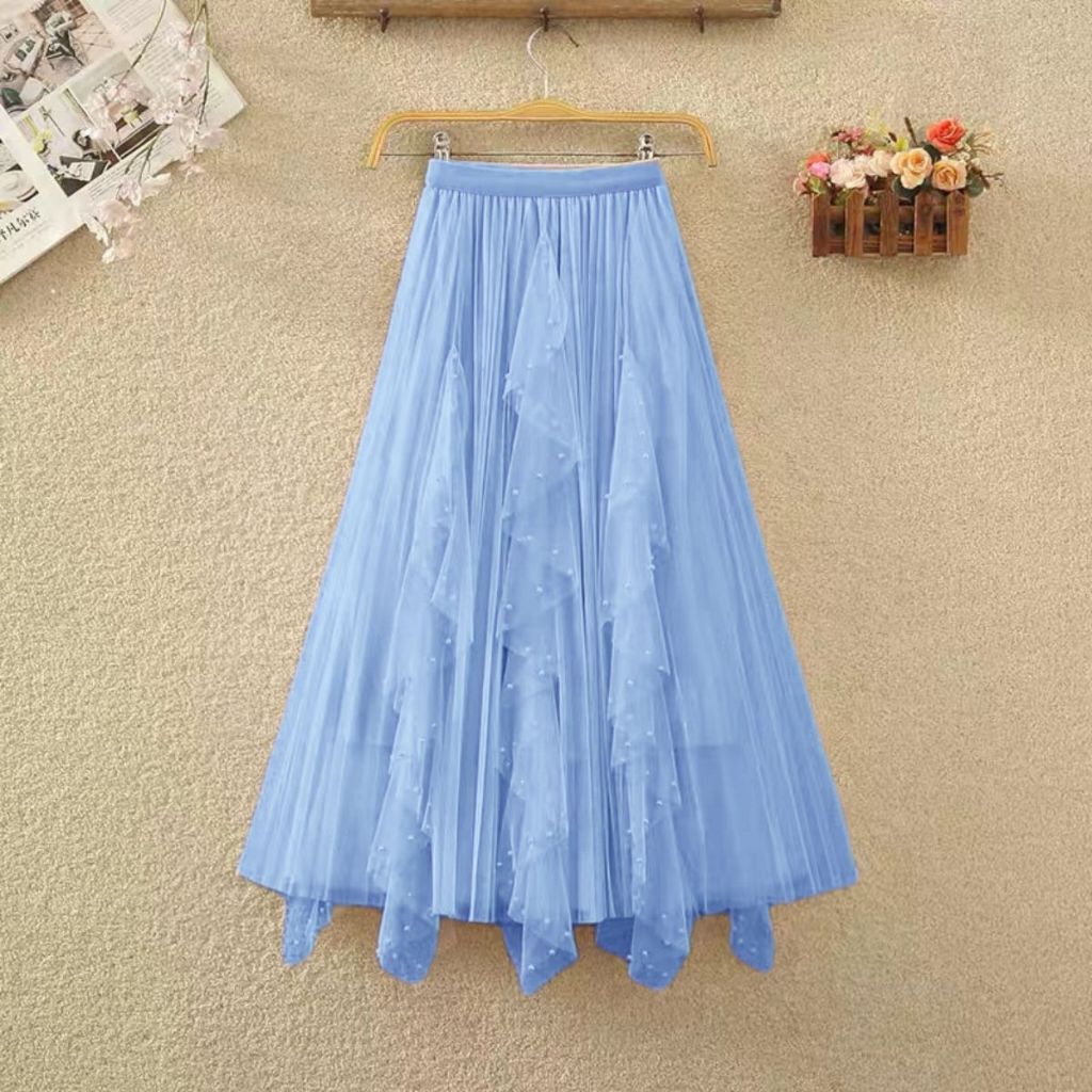Saia de tule com contas irregulares para mulheres 2025 nova saia plissada com cintura elástica e comprimento médio