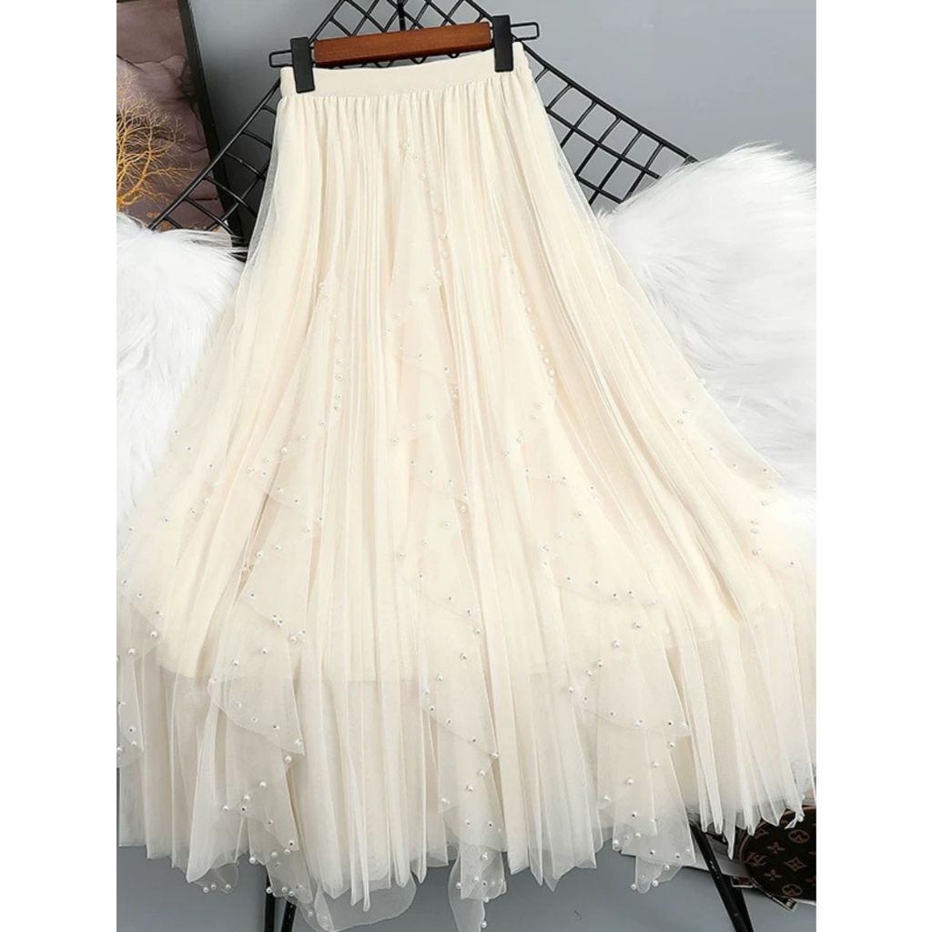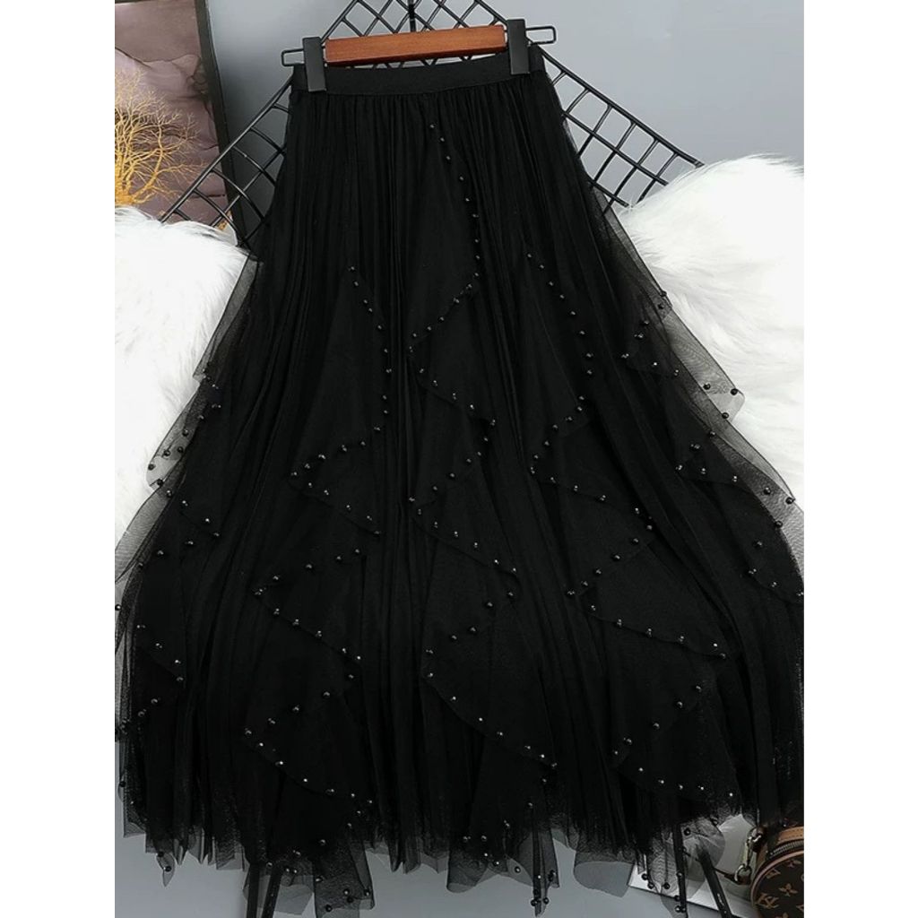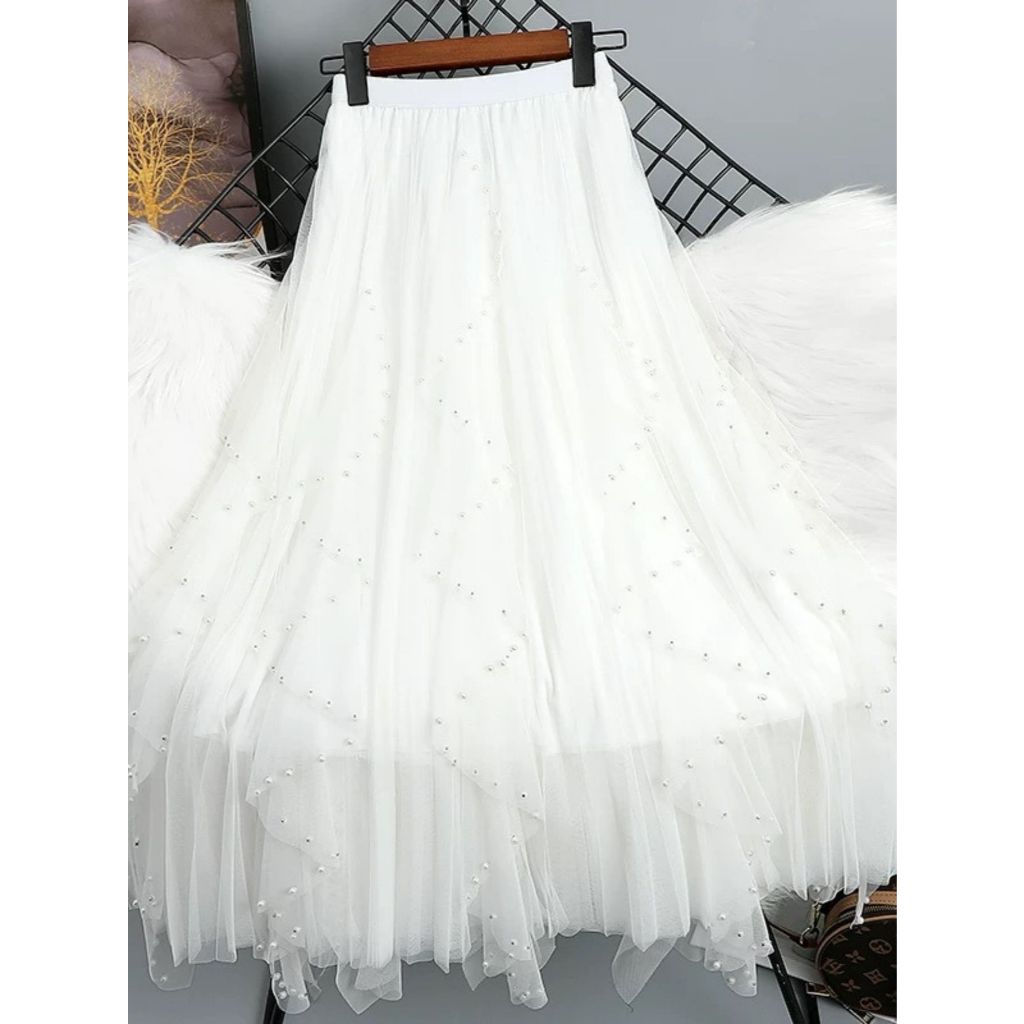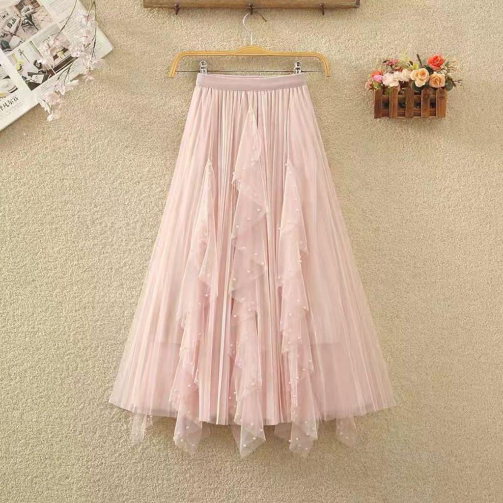 Saia de tule com contas irregulares para mulheres 2025 nova saia plissada com cintura elástica e comprimento médio