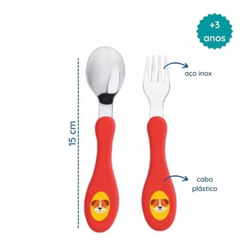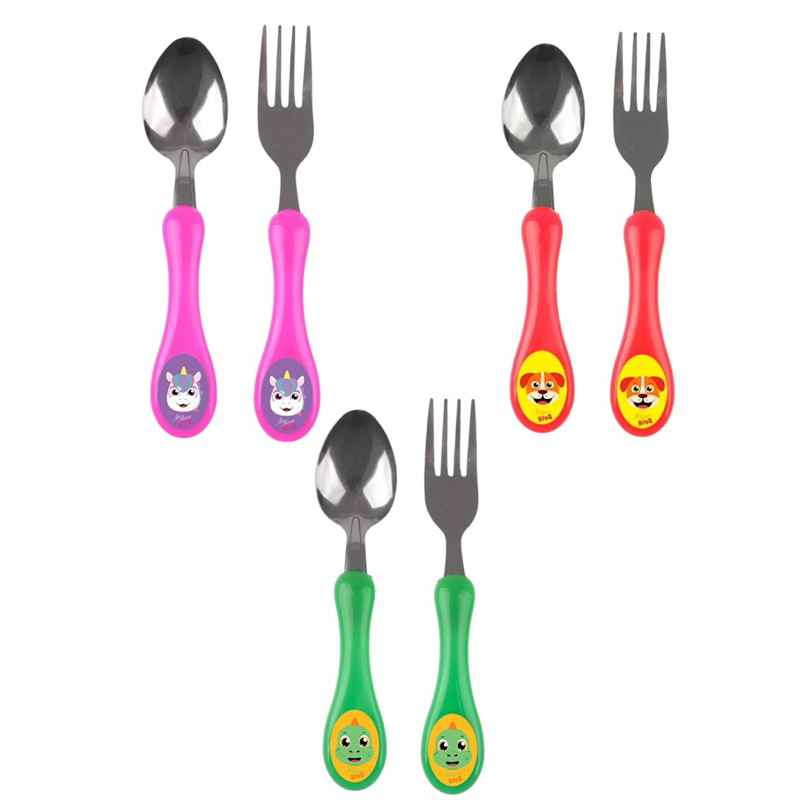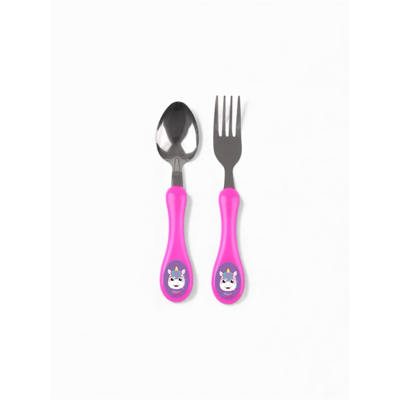 Kit Talheres Infantil com colher e garfo em inox, cabo anatômico rosa e estampa de Unicornio/Dinossauro/Cachorro.