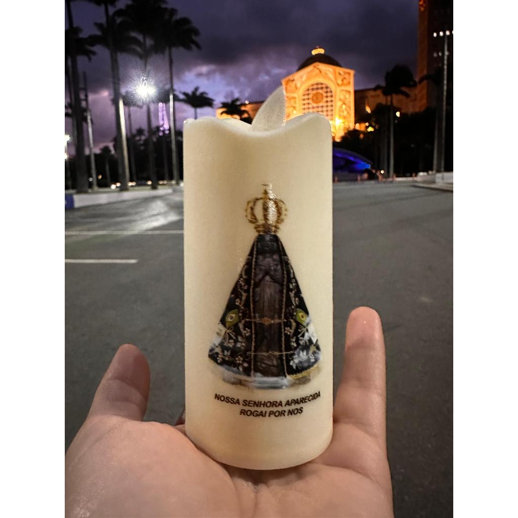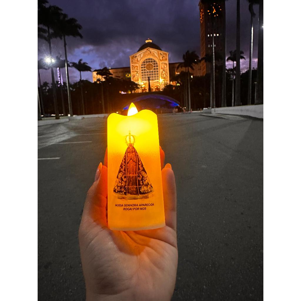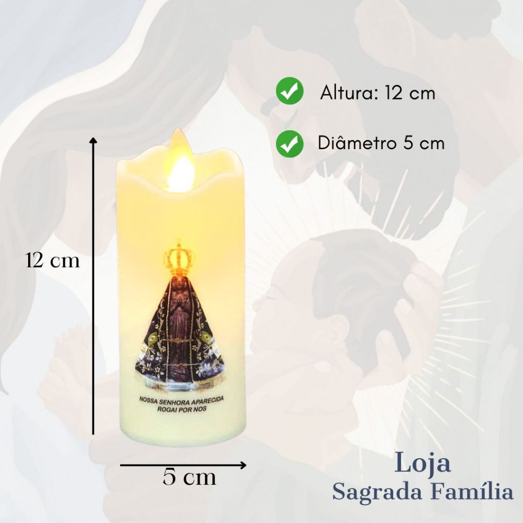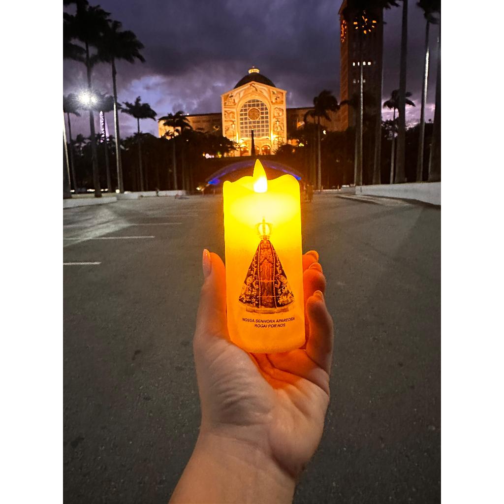 Vela Eletrônica LED Nossa Senhora Aparecida 12cm Chama Móvel Realista a Pilha 2xAA Decorativa