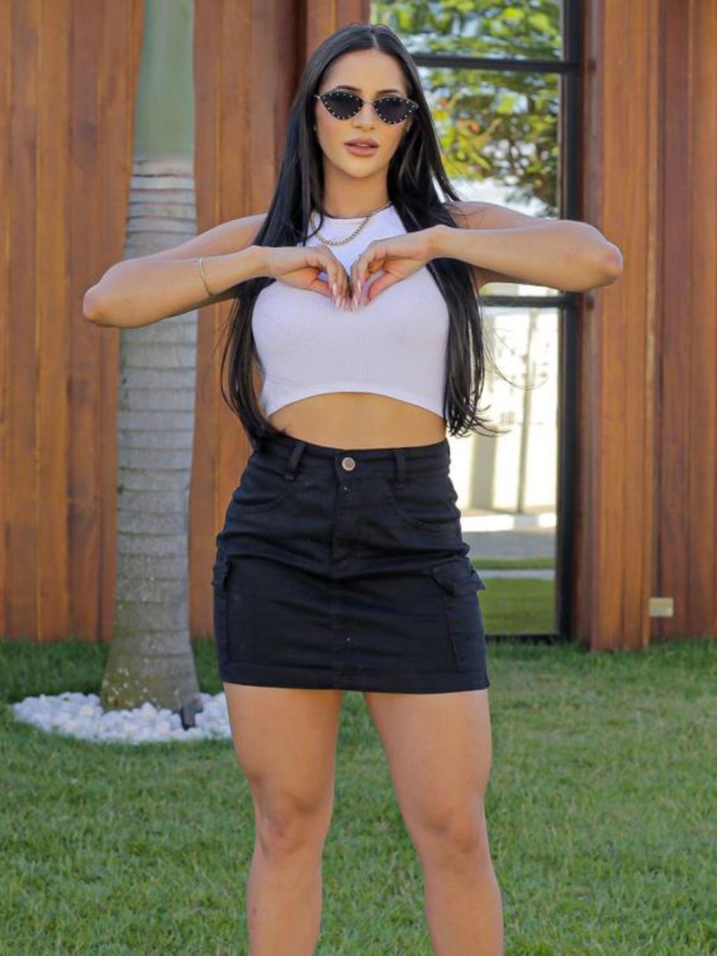 Saia Cargo Feminina Jeans Preta Cintura Alta Bolso Lateral.