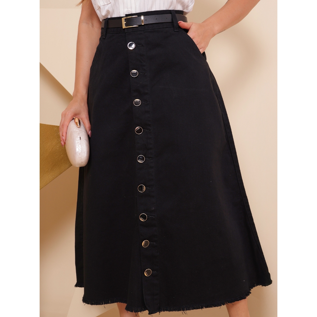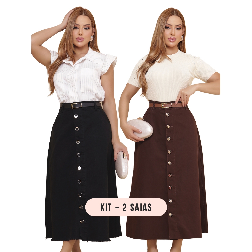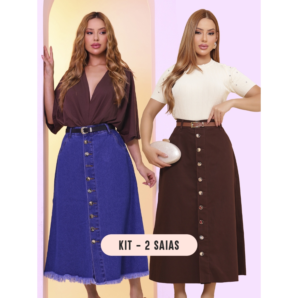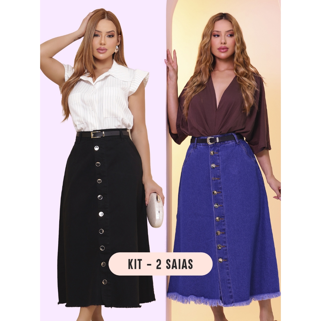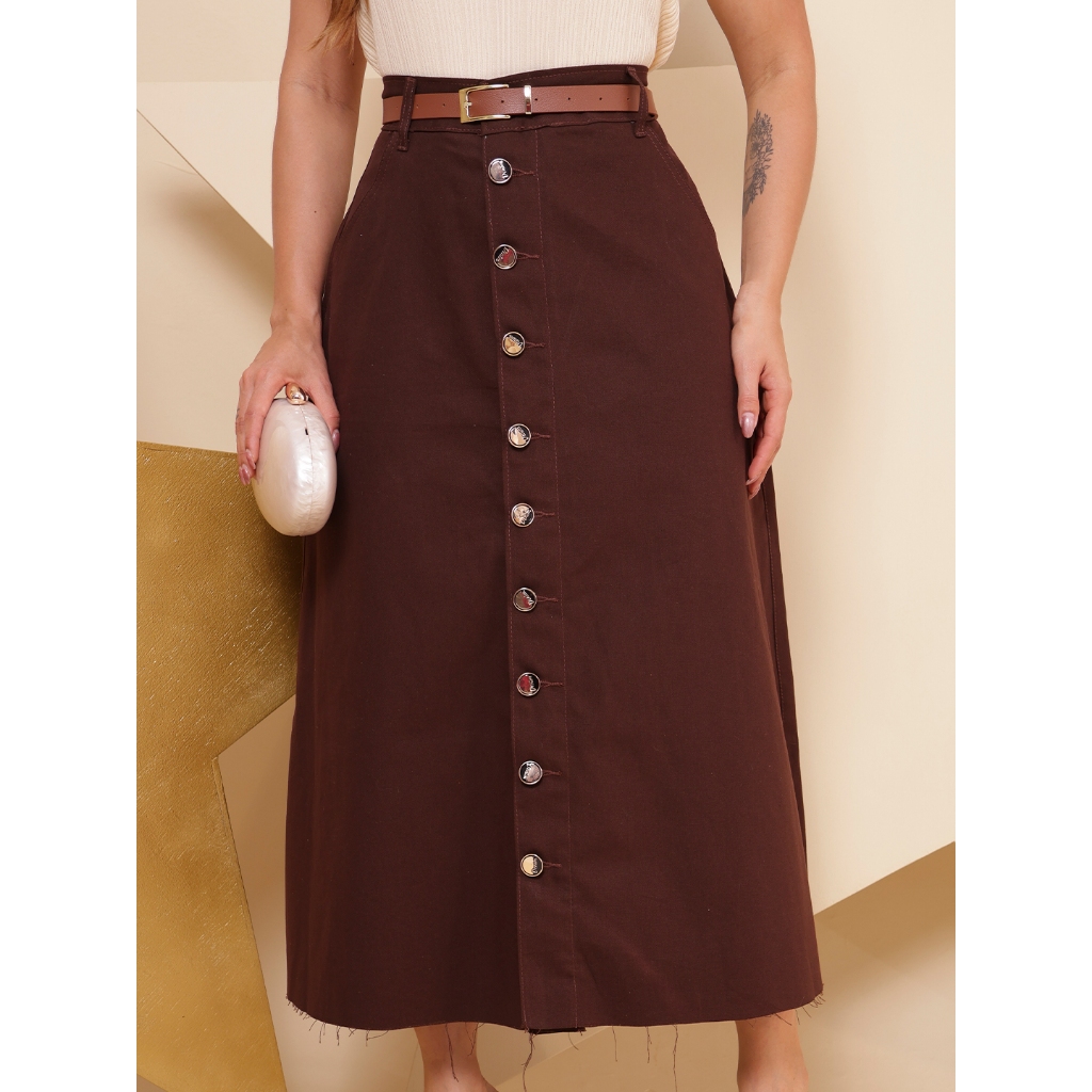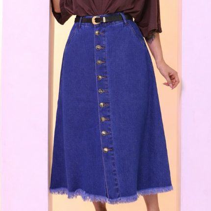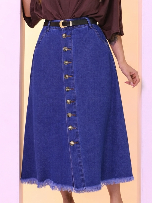 Saia Longa Feminina Moda Evangélica em Brim - Acompanha Cinto - Barra Desfiada