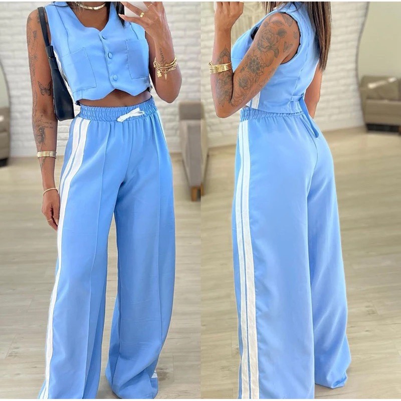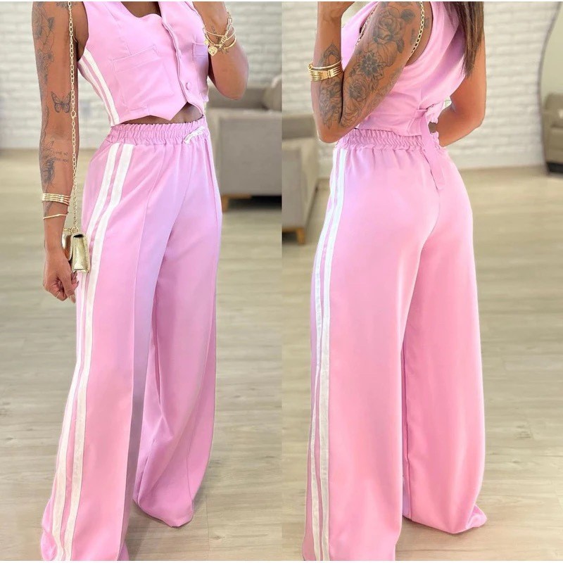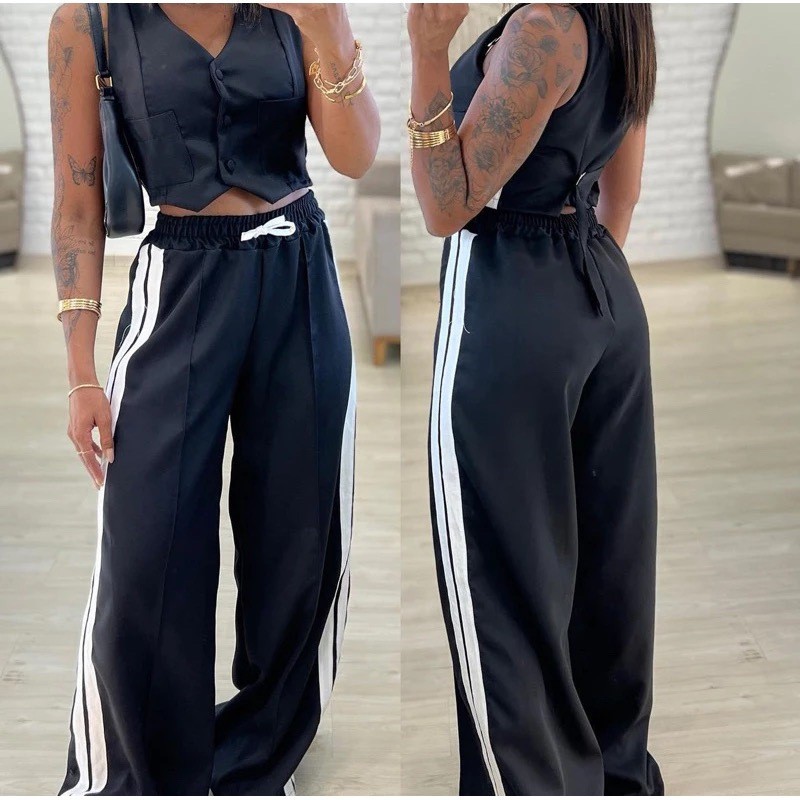 Calça pantalona feminina trackpants wida leg listra lateral larga