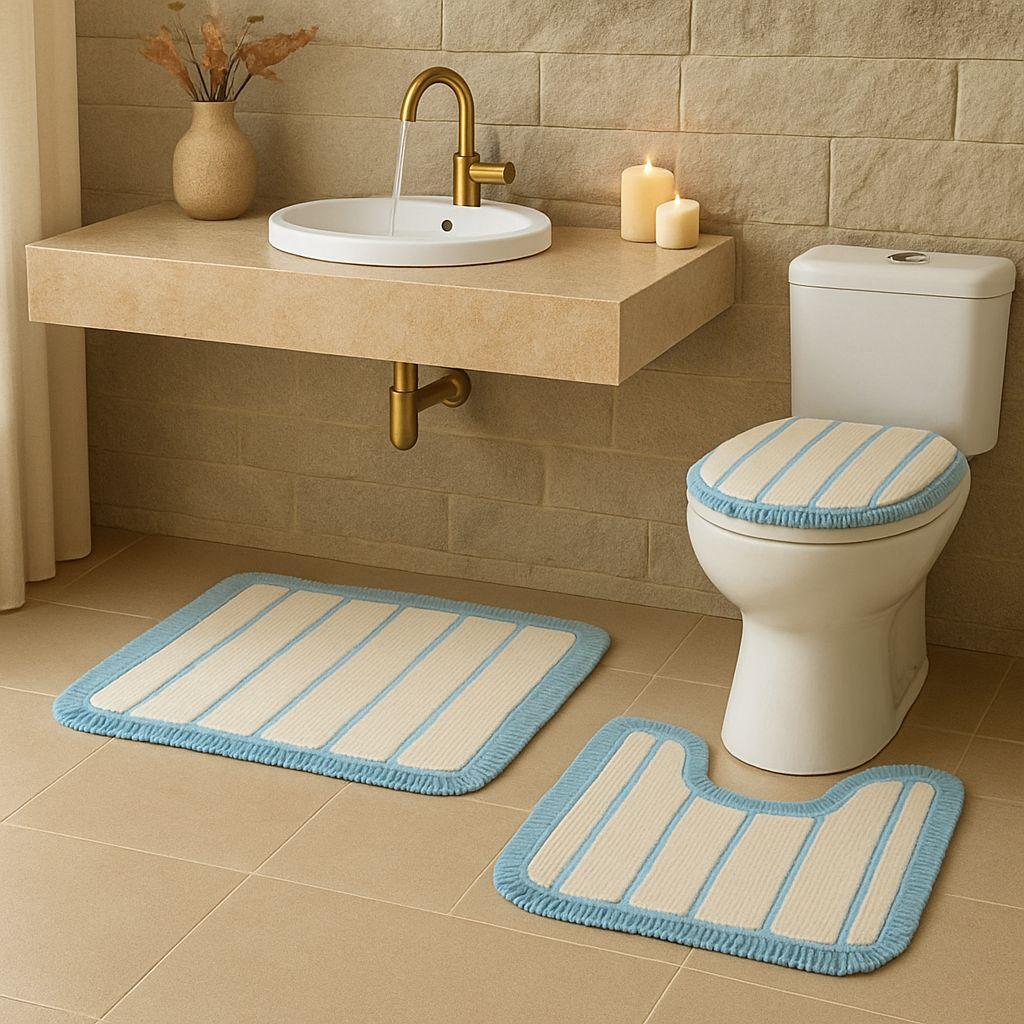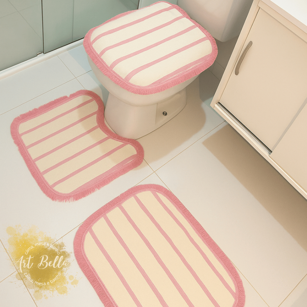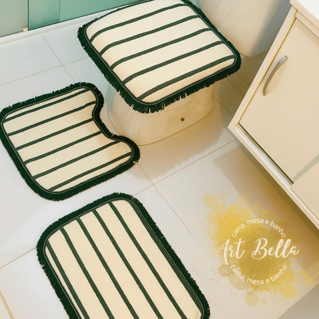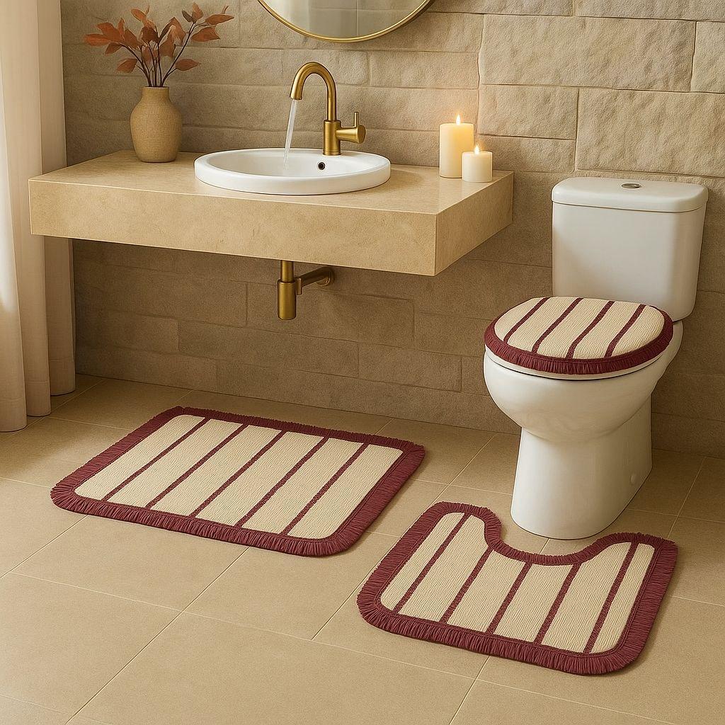 Kit Tapete Banheiro com 3 peças algodão Premium Jogo de Banheiro Decoração listras com franja