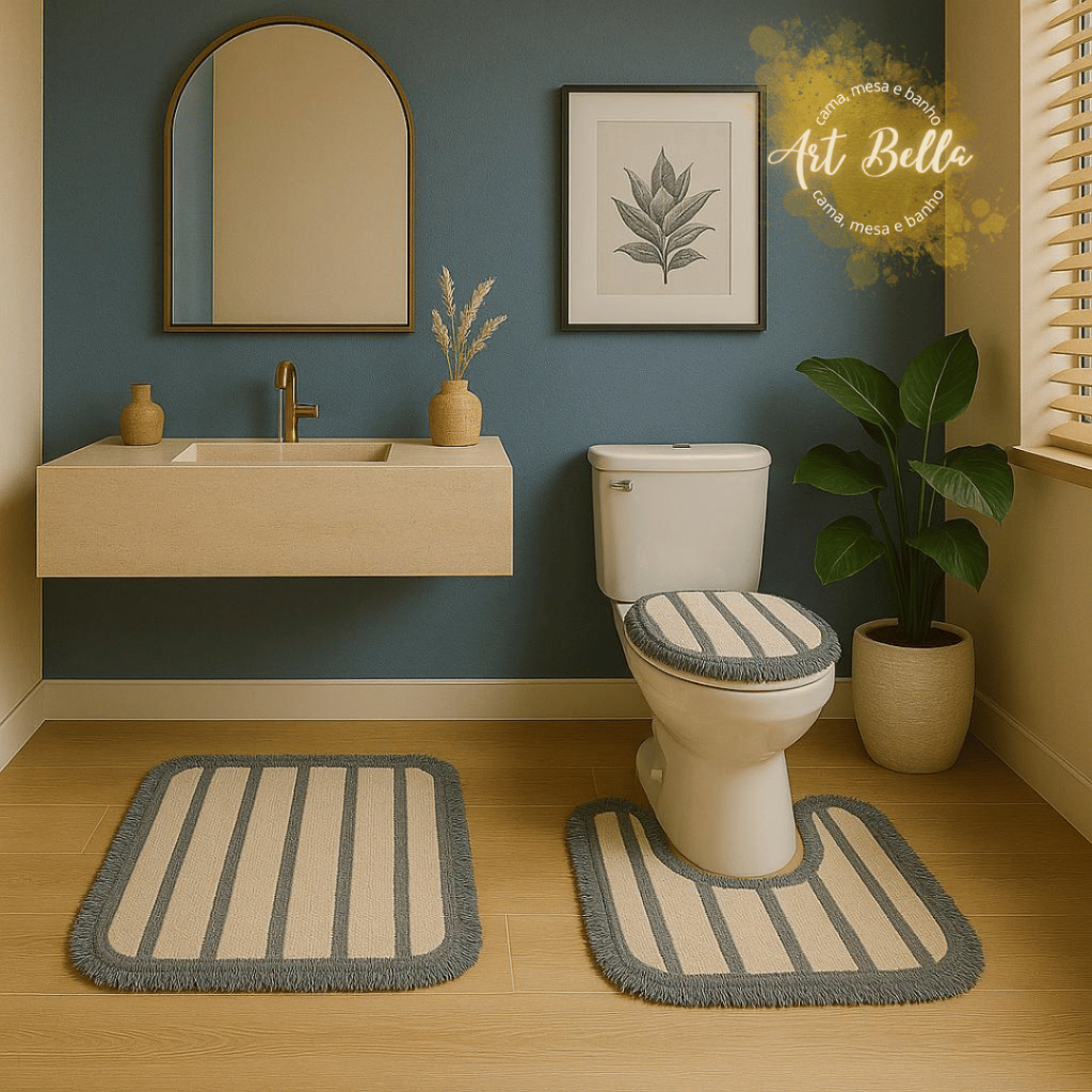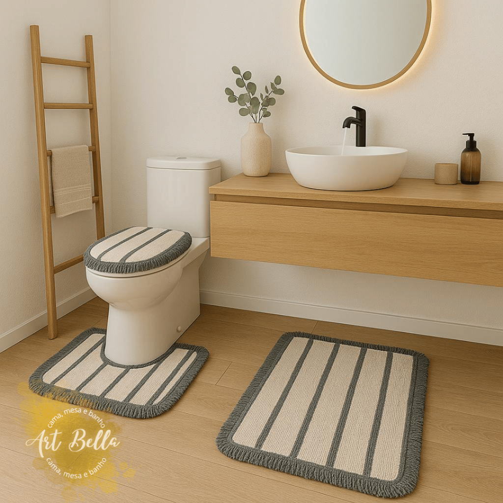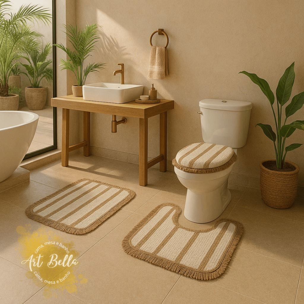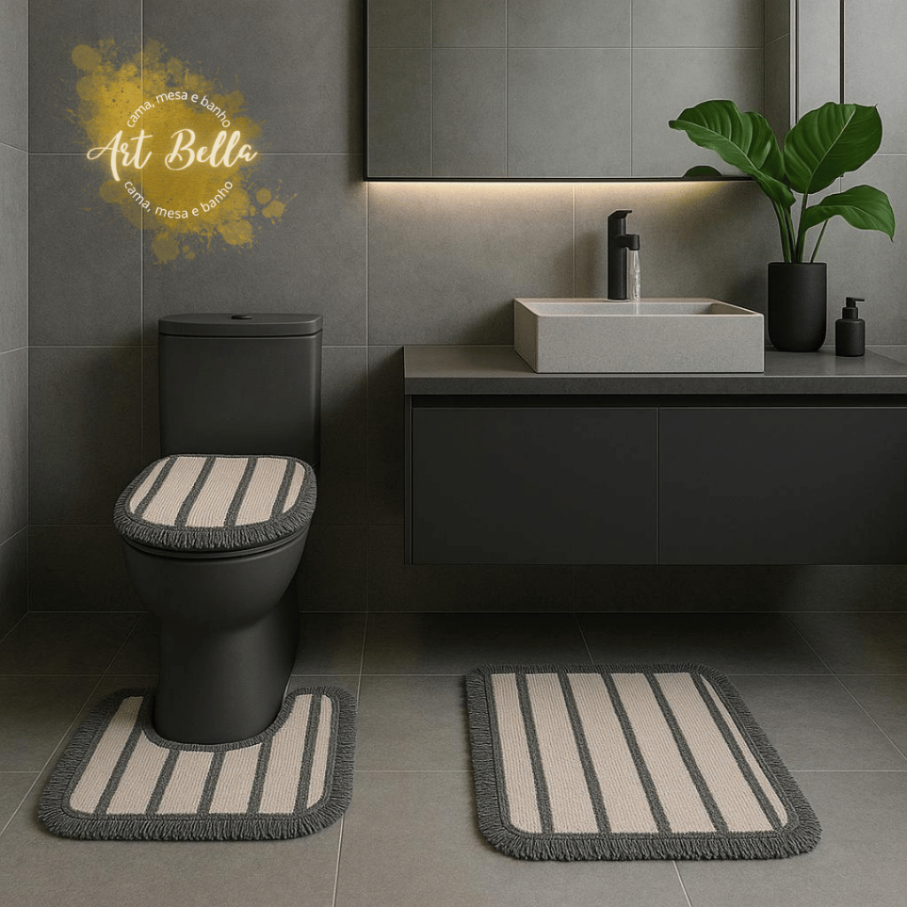 Kit Tapete Banheiro com 3 peças algodão Premium Jogo de Banheiro Decoração listras com franja