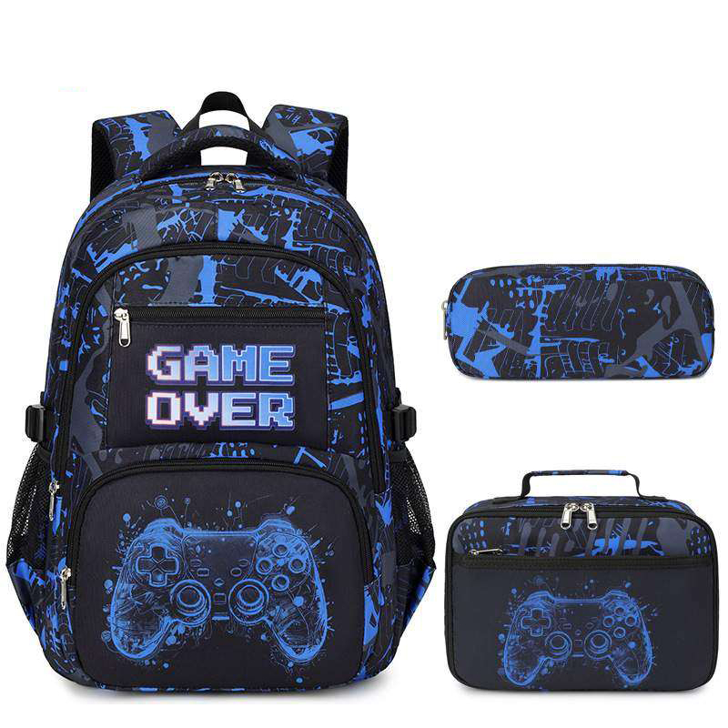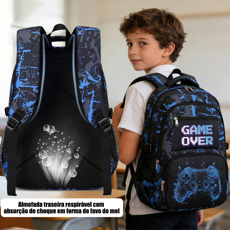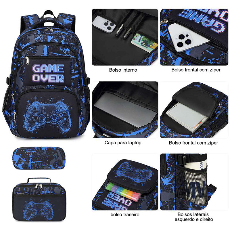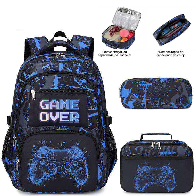 Kit Mochila Escolar Infantil 3 em 1 Gamer Preta Tema Videogame Controle – Mochila, Bolsa e Estojo | QUEBOM