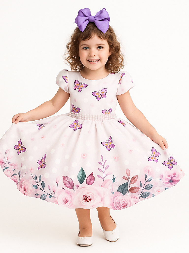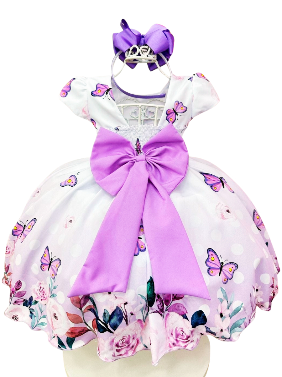 Vestido Infantil Borboletas Lilás 🎀 Festa Princesa com Flores e Pérolas