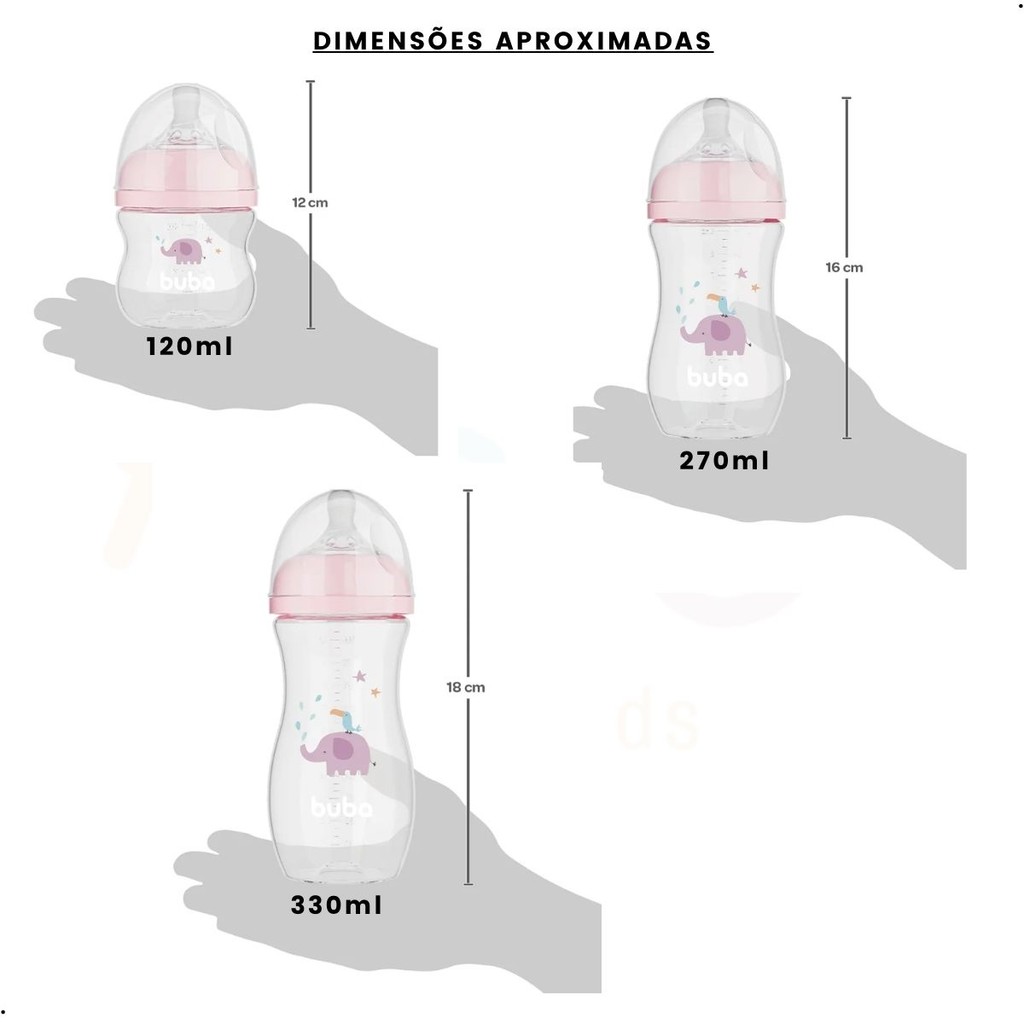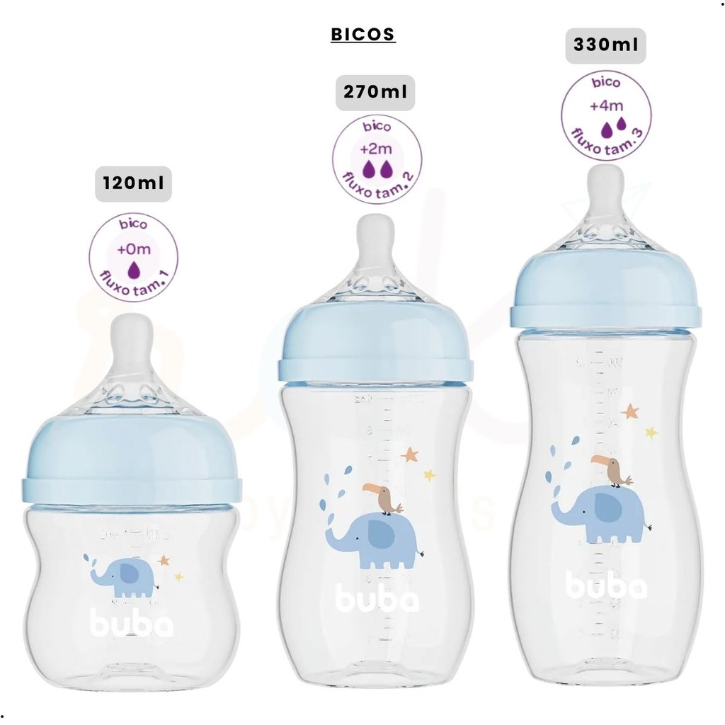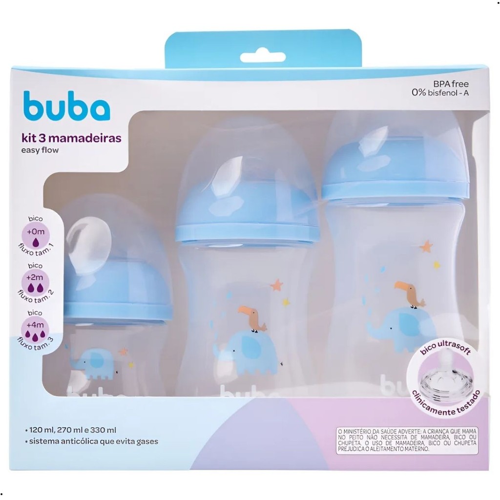 Kit 3 Mamadeiras Anticólica Buba 120ml, 270ml e 330ml Easy Flow Elefante