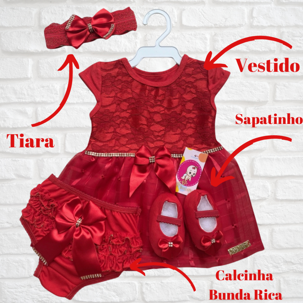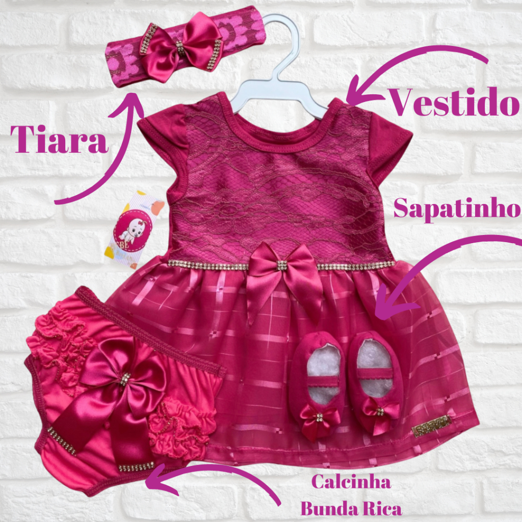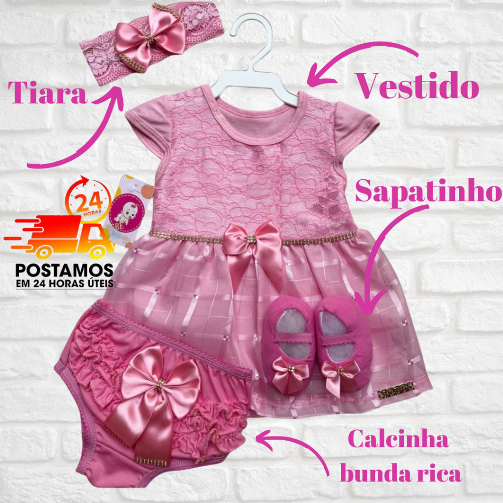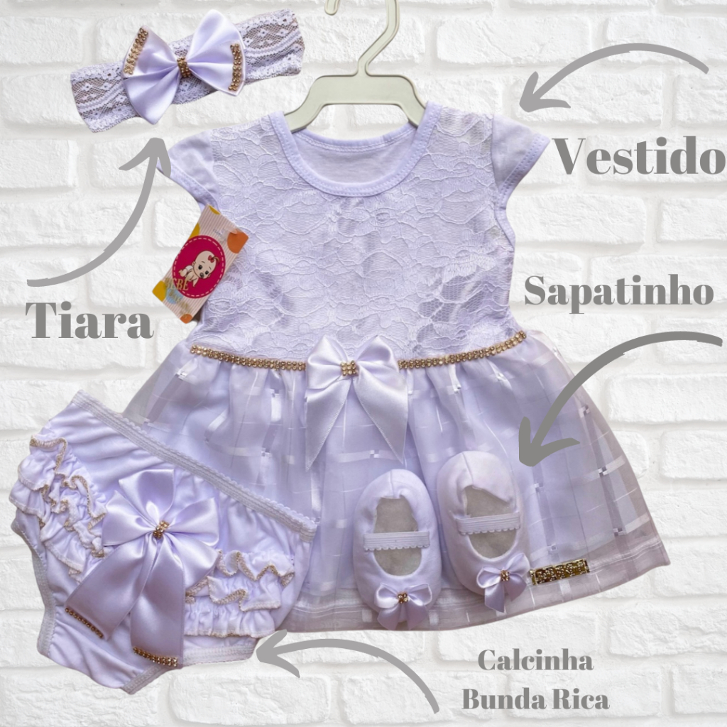 Vestido De Bebê Com Kit de Sapatinho Calcinha Tiara Com Laço