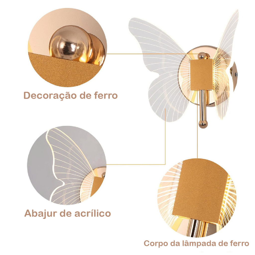 Luminária Arandela Borboleta Dourada LED de Parede 3 Tons de Luz iluminação interna Bivolt