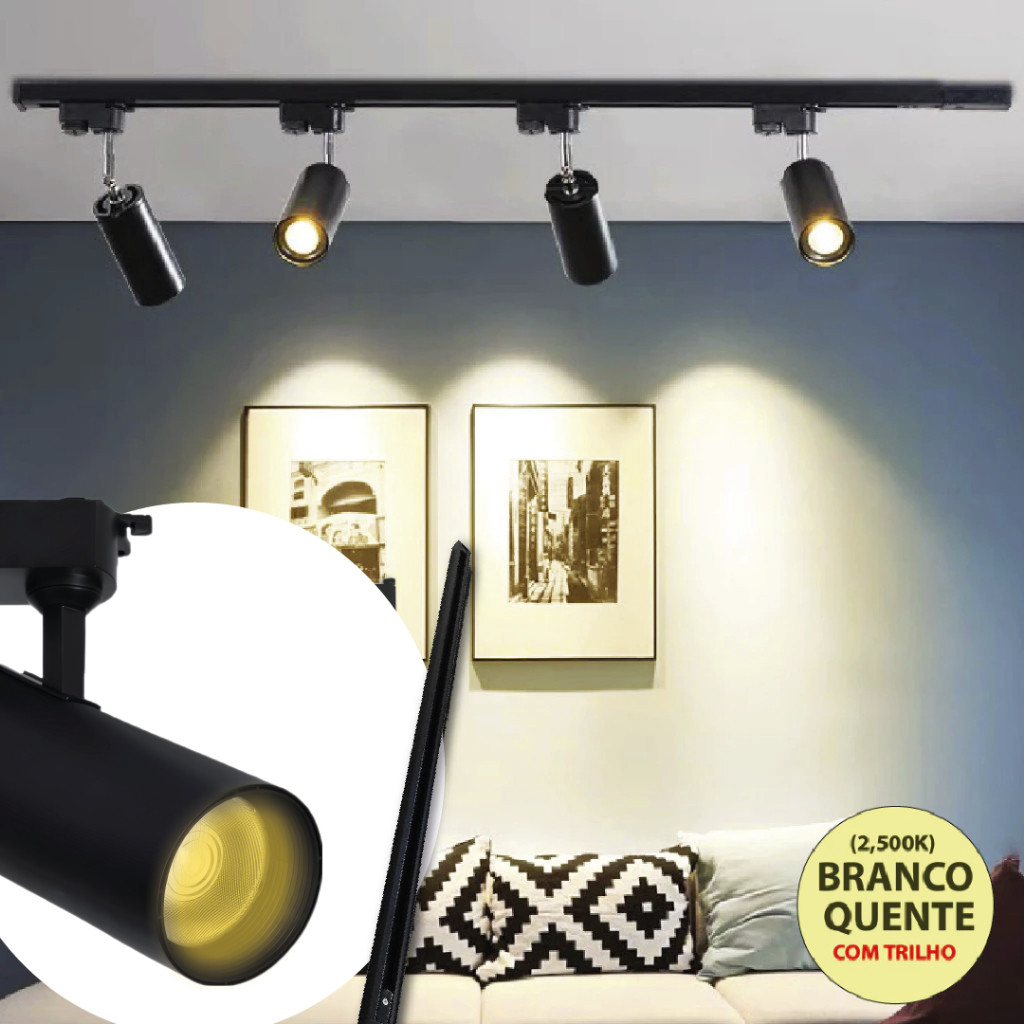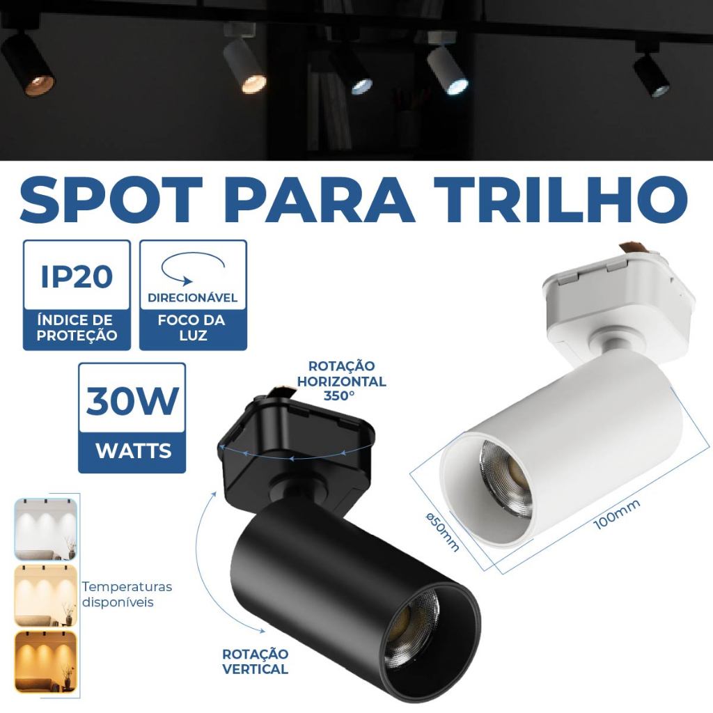 Spot LED para trilho eletrificado Tubinho Branco ou Preto 30W 360° Luz Fria, Neutra e Quente Bivolt