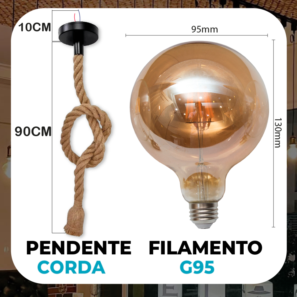 Pendente Corda 2M + Filamento Led G95 4W Retro Vintage Rústico Sisal E27 Luz Quente Bivolt 110V-220V