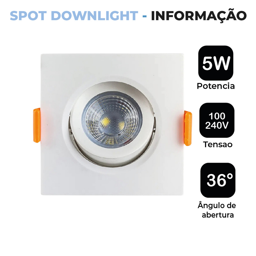 Kit 5 Luminária Spot Led Quadrado Direcionável 5W Embutir Gesso Teto | Branco Quente 3000K | Branco Frio 6500K Bivolt