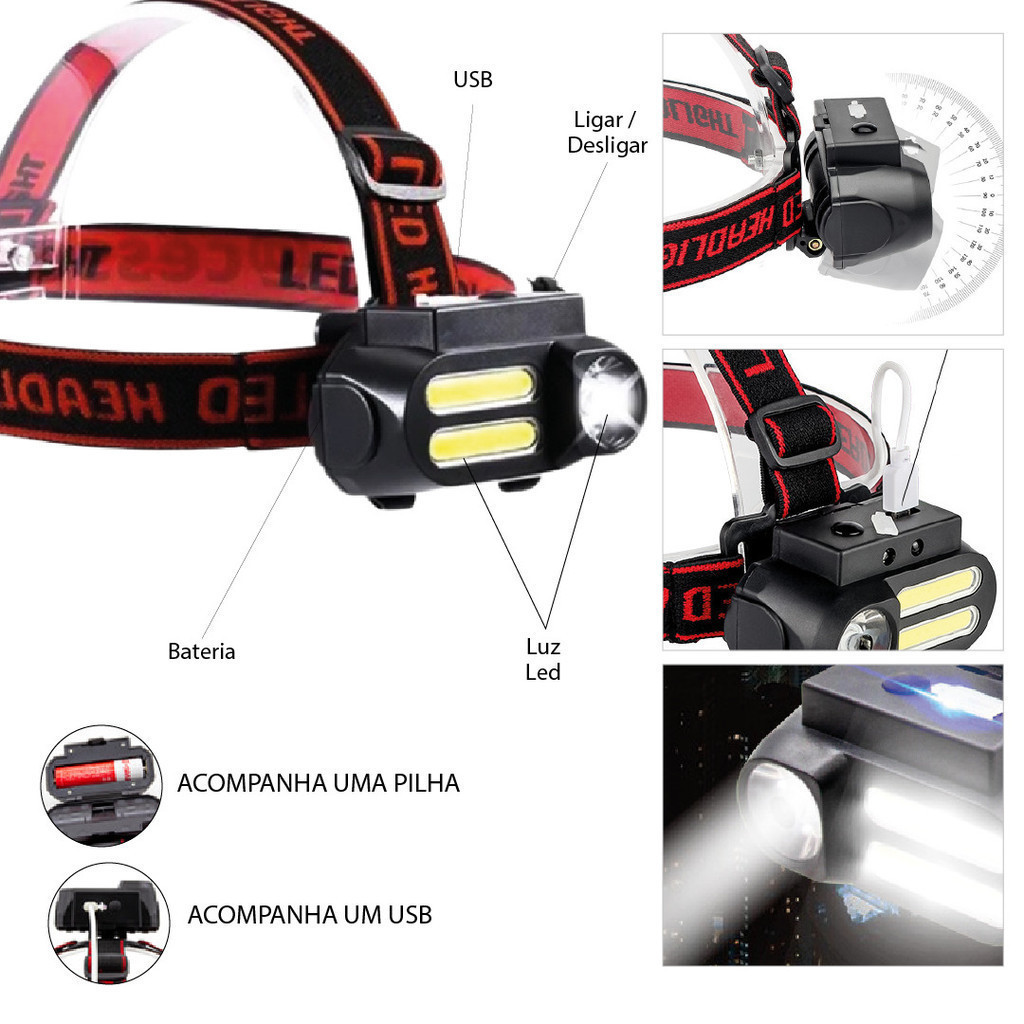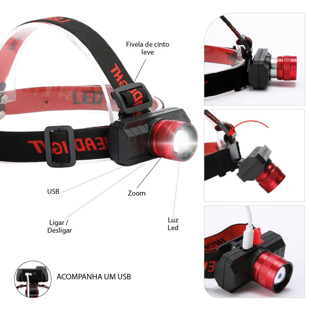 Lanterna Cabeça Led Turbo com Ajuste Angular 2 Modelos Lite e Pro Recarregável USB