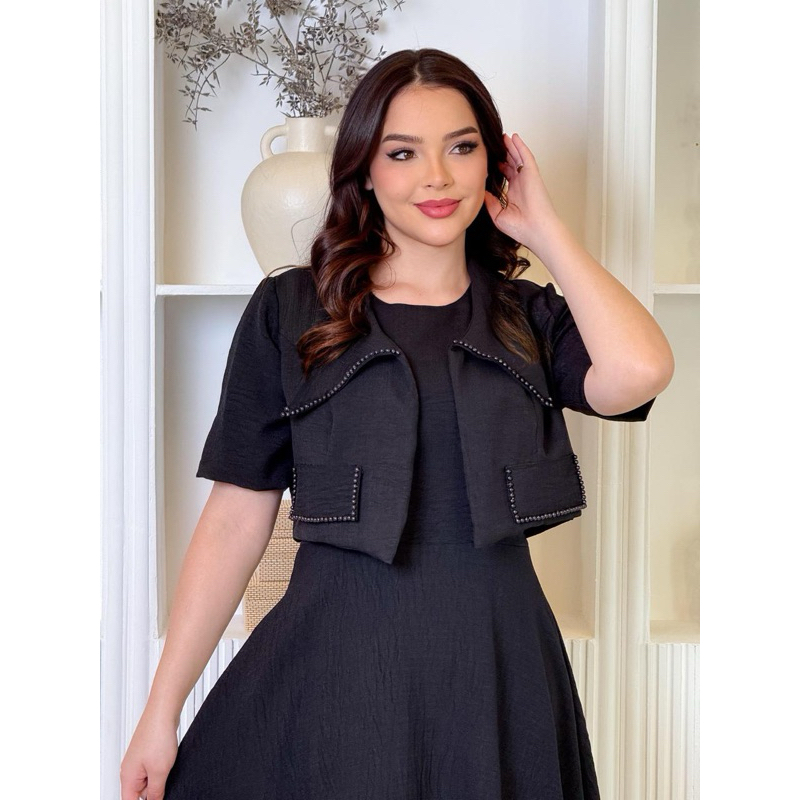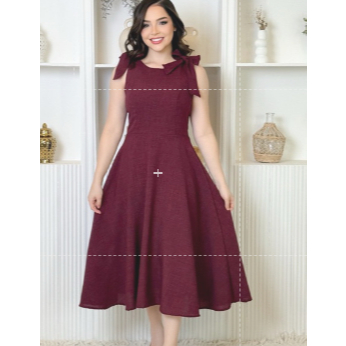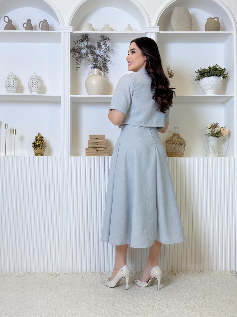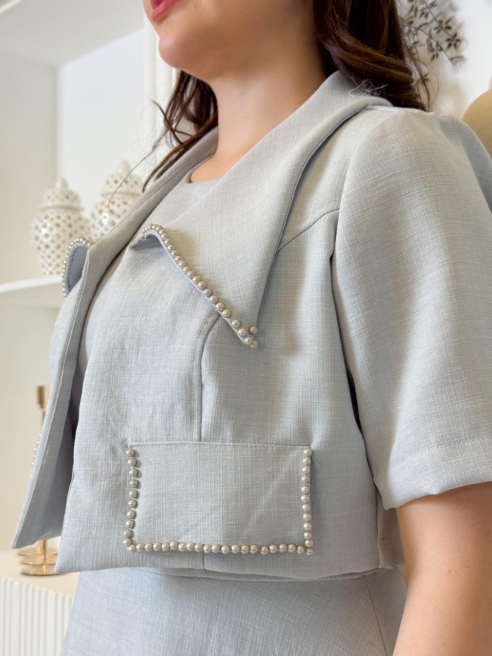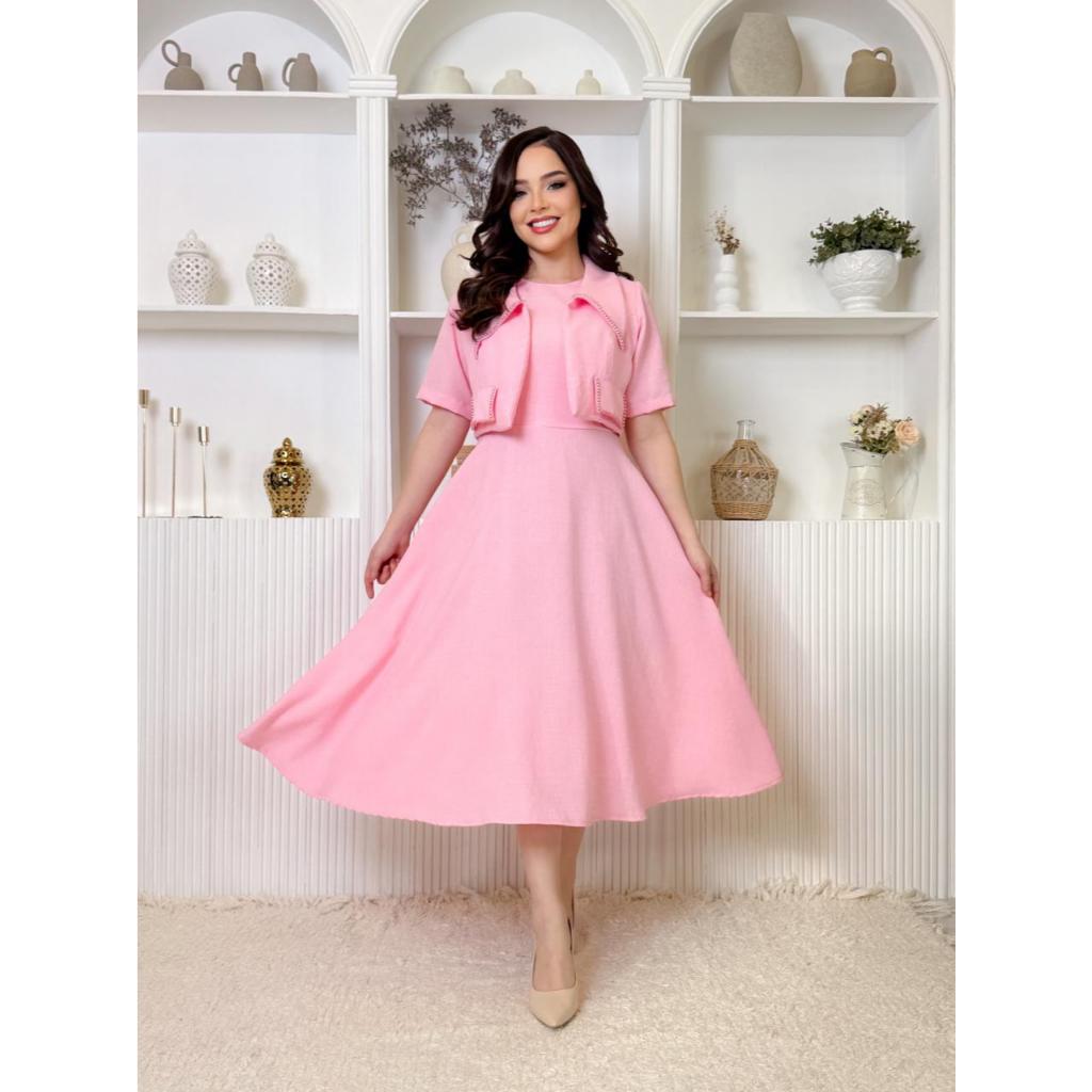 Conjunto de Vestido Midi de Linho Casual Amarração Ombro + Pérolas e Casaco Elegância para Casamento