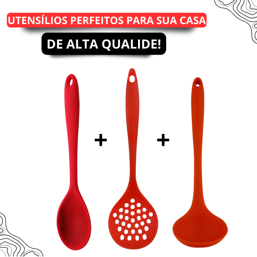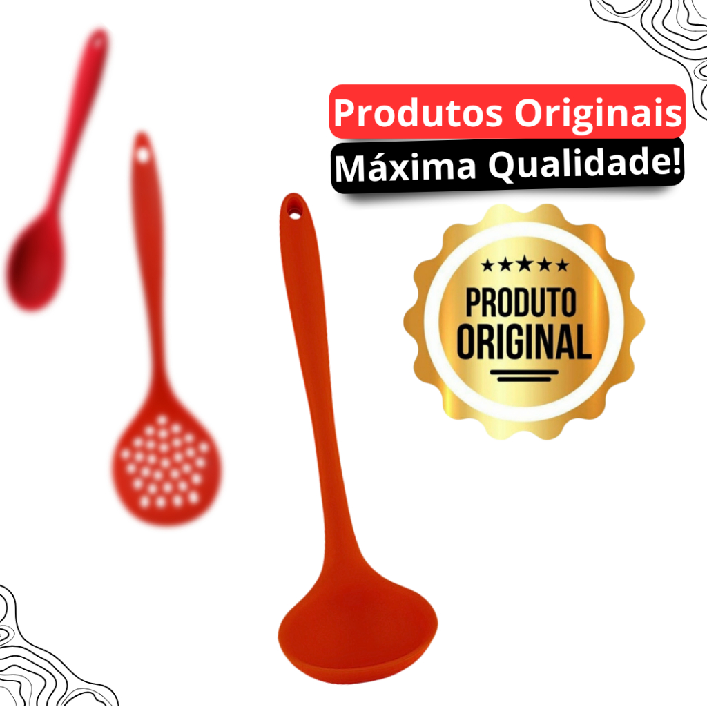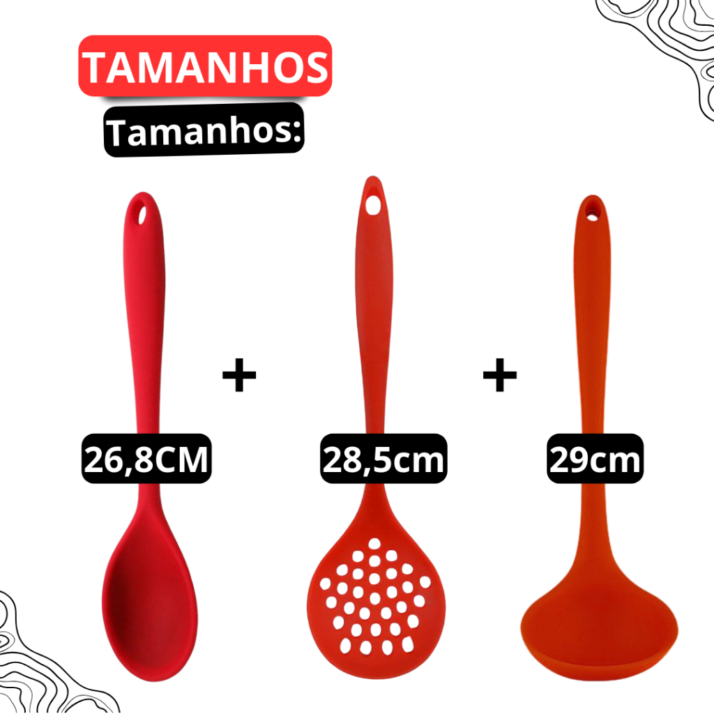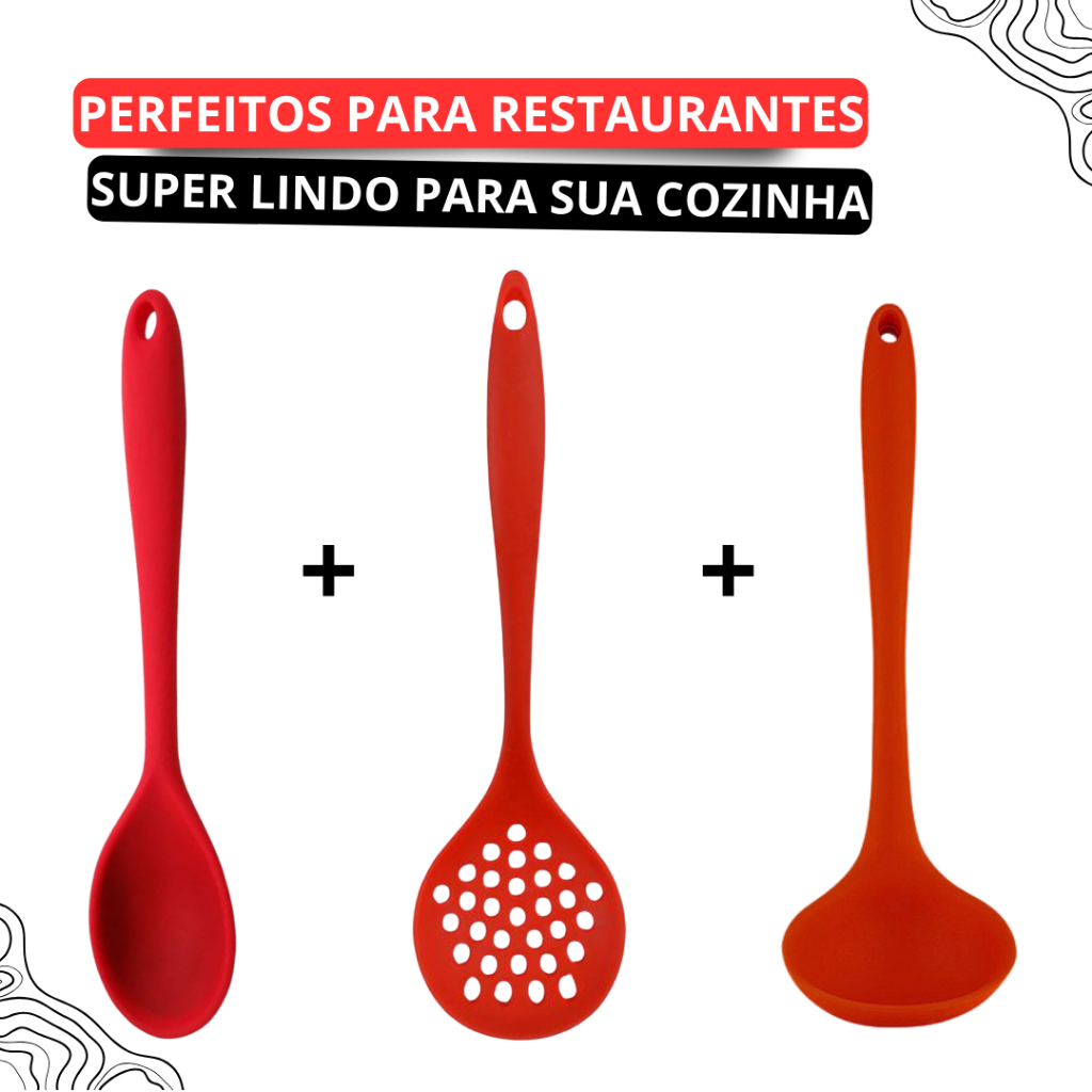 Kit 3 Utensílios de Silicone Vermelhos - Escumadeira Concha e Colher de Servir