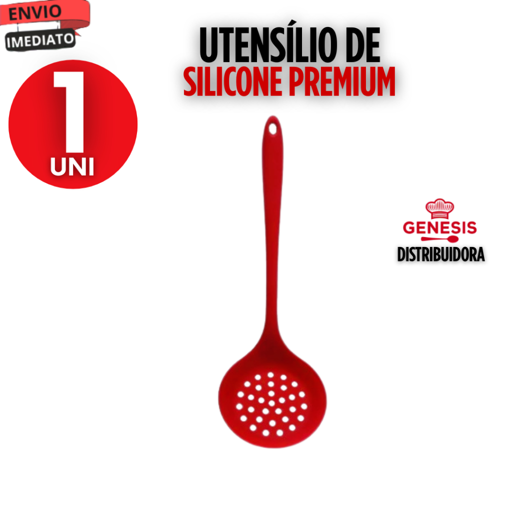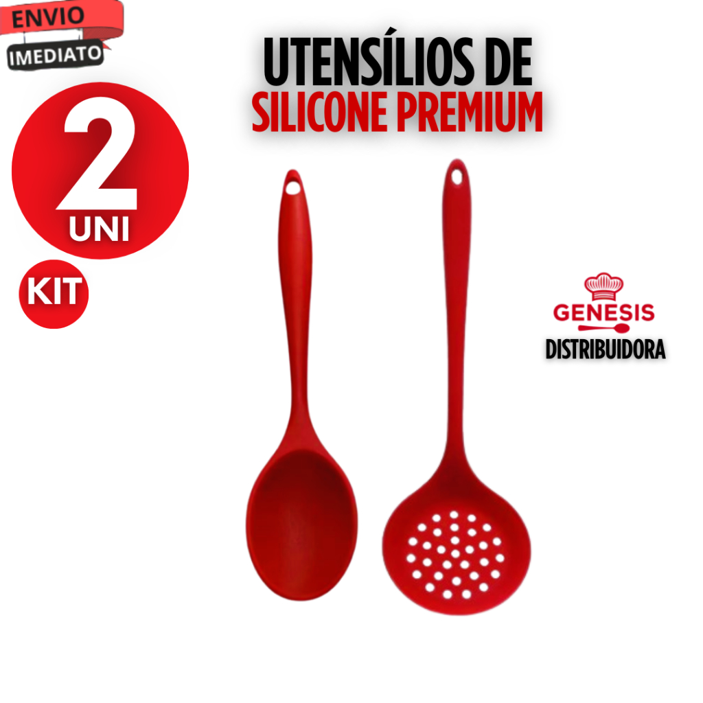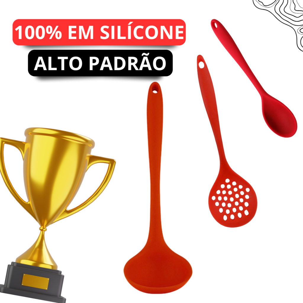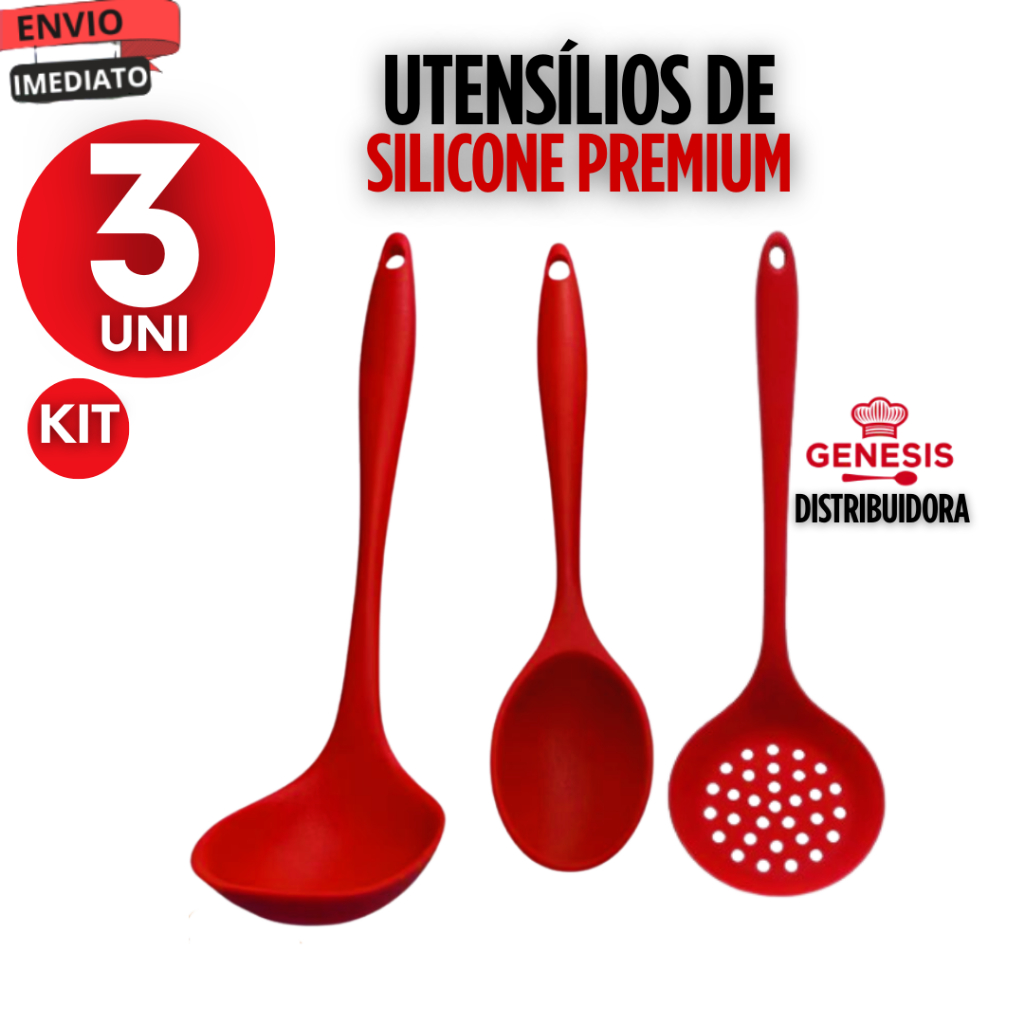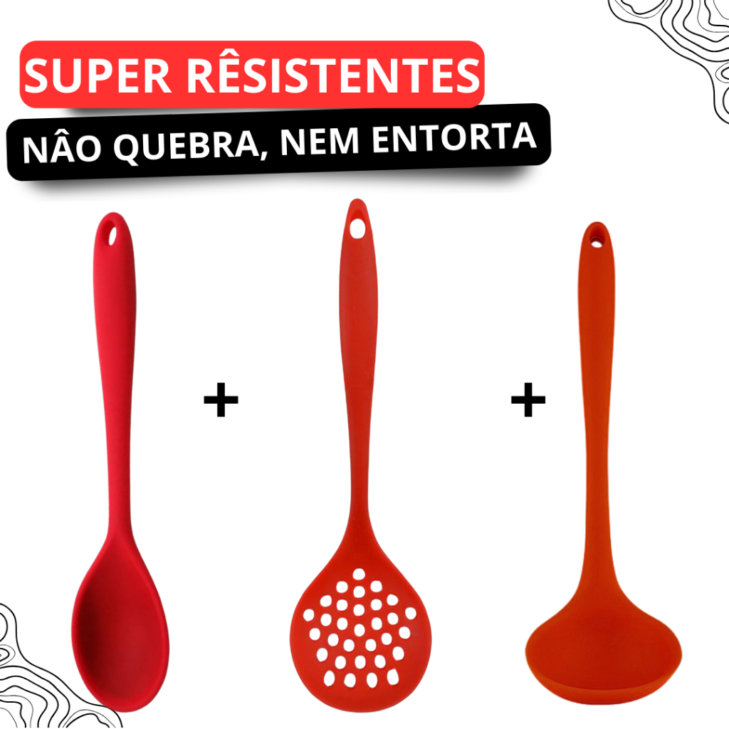 Kit 3 Utensílios de Silicone Vermelhos - Escumadeira Concha e Colher de Servir
