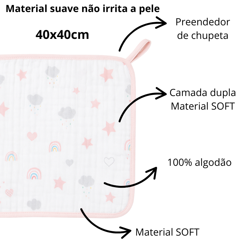 Kit Paninho de Boca Papi Soft 2 Unidades 40x40cm com Prendedor de Chupeta menino menina
