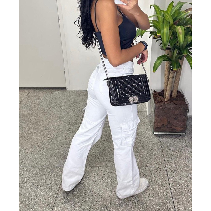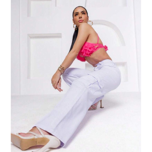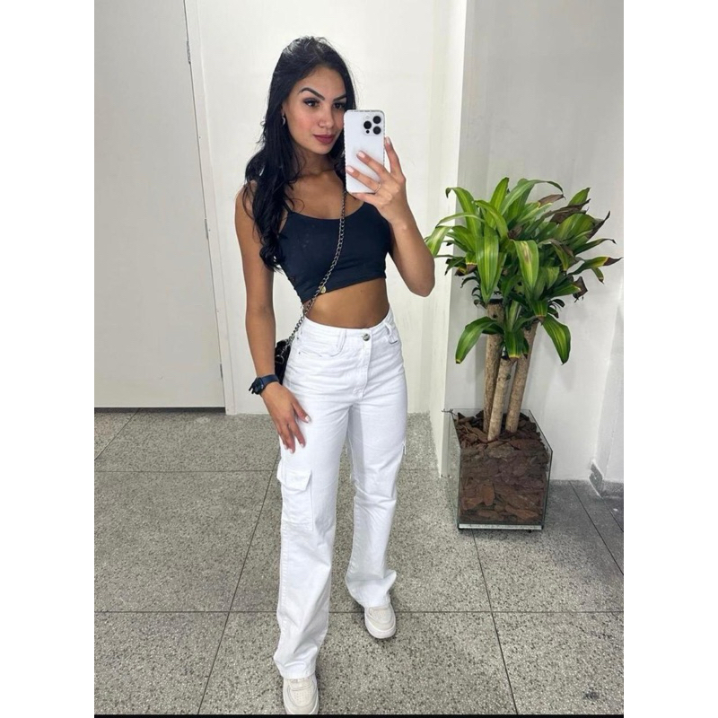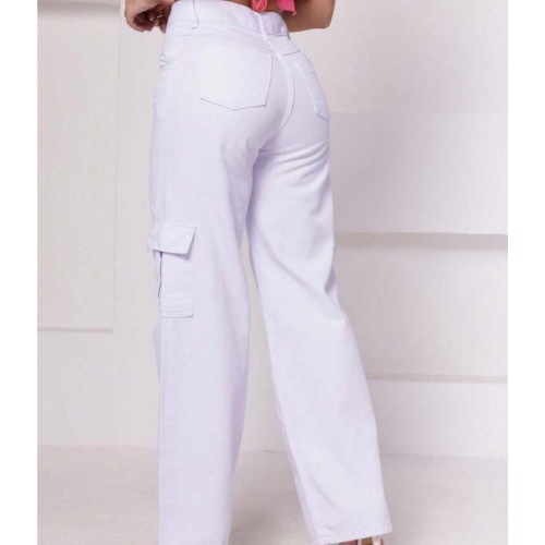1578 Calça Jeans wideleg cargo Branco-feminina